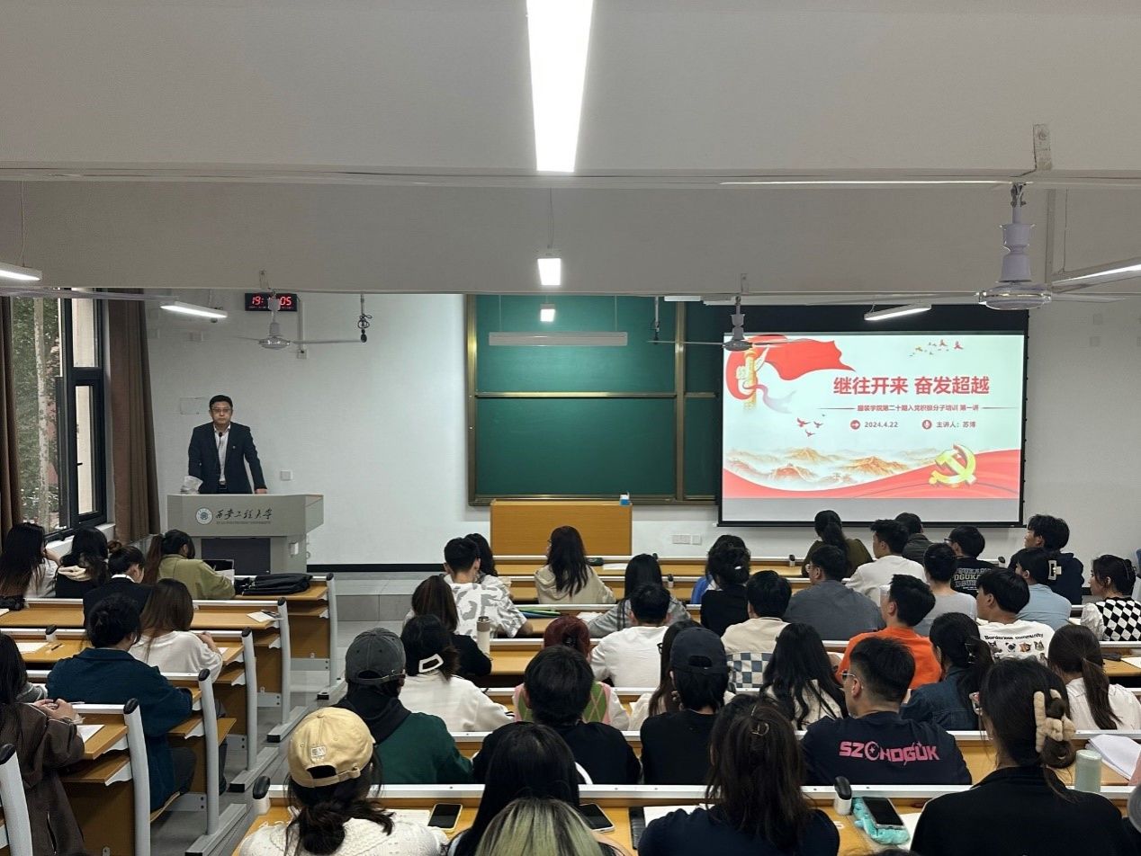 4月22日,在学院第二十期入党积极分子培训班上,院党委书记苏博以《继往开来 奋发超越》为主题作开班第一堂党课。党课从四个方面讲解了党章的总纲部分以及党纪学习教育等内容。4月24日,院党委副书记马磊以“厚植爱国情怀,勇担时代使命”作专题党课讲座,从学习习近平总书记关于高等教育的重要讲话、习近平总书记庆祝建党百年大会上的讲话、习近平总书记党史学习教育动员会上的讲话、习近平总书记来陕考察重要讲话四个方面,引导学生深刻领会习近平总书记重要讲话精神,争做时代优秀青年。4月25日,学院邀请韩h漫