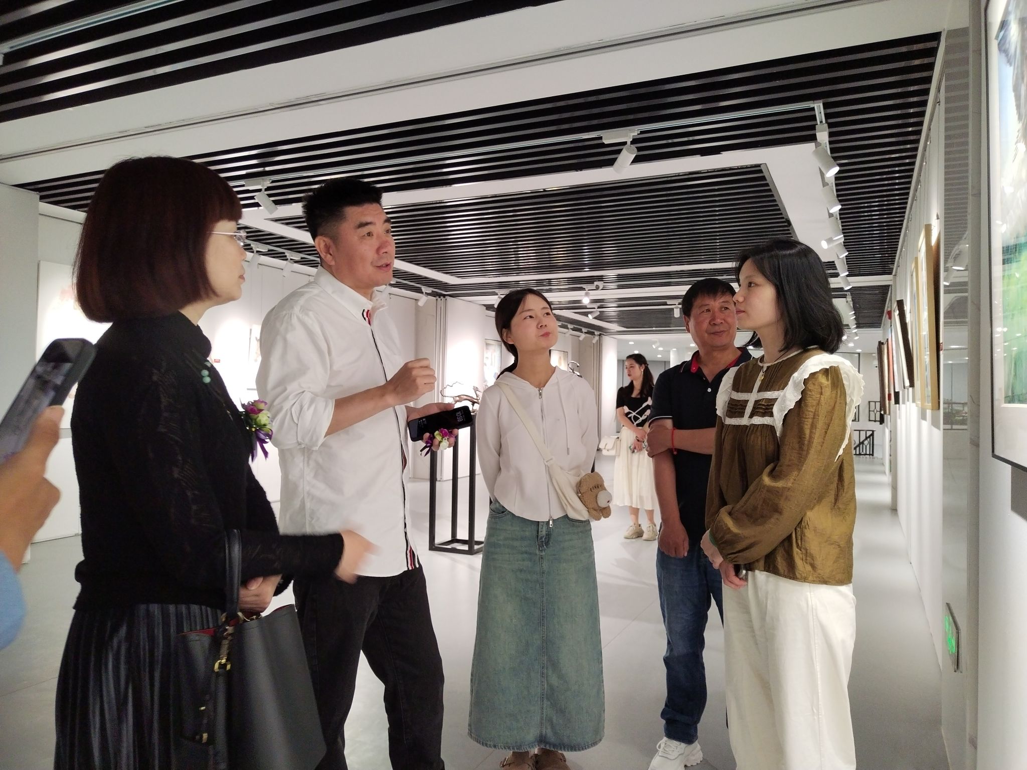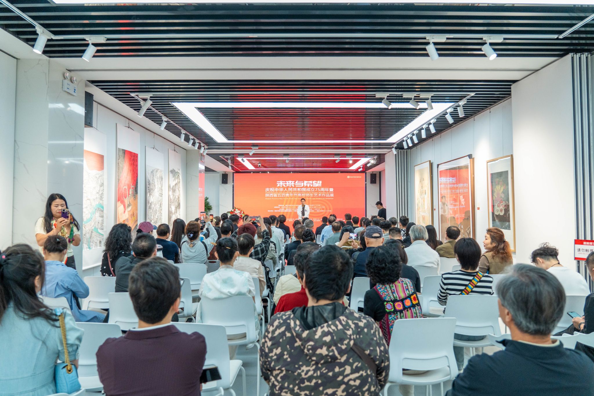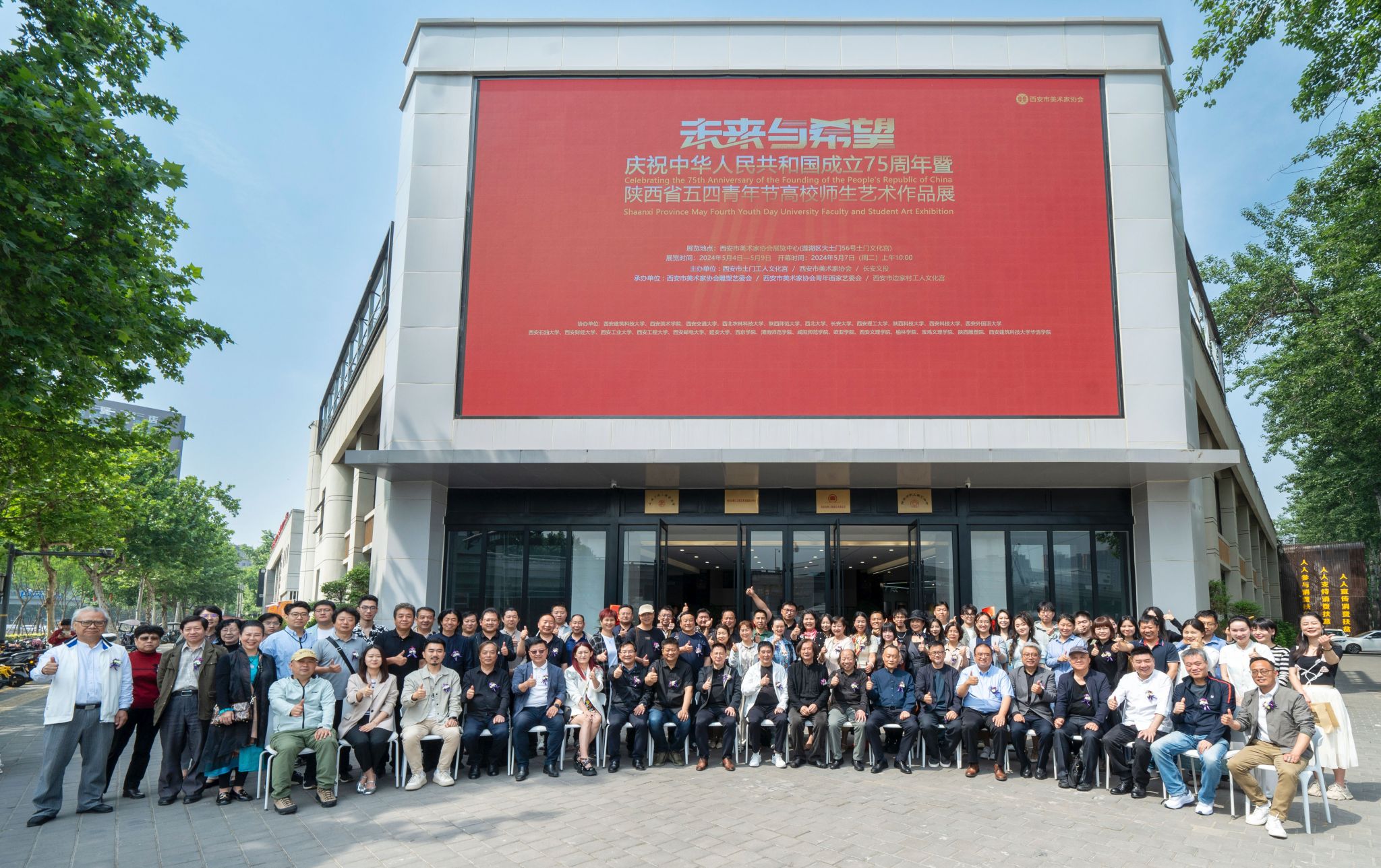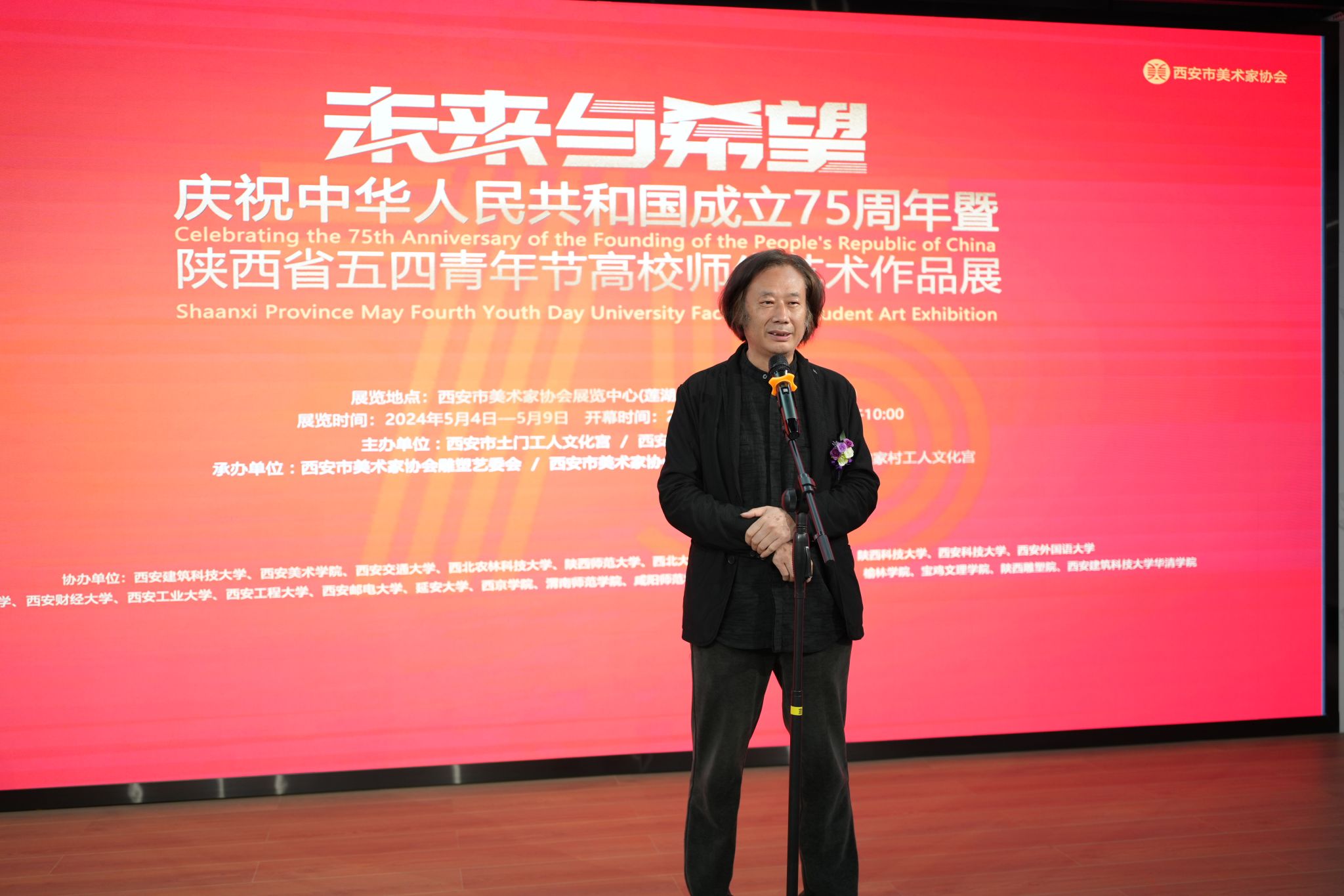 5月7日上午十点,“未来与希望”庆祝中华人民共和国成立七十五周年暨陕西省五四青年节高校师生艺术作品展在西安市美术家协会展览中心展出。陕西省美术家协会副主席蔺宝刚,西安市美术家协会主席杨霜林、西北大学艺术学院院长郭琳、西安交通大学米兰理工大学联合设计与创新学院院长蒋维乐,西安工程大学韩h漫
