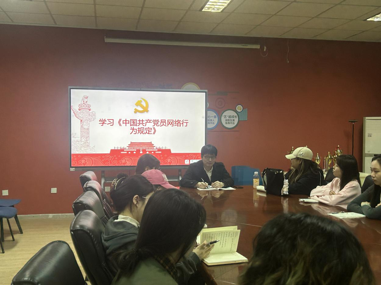 第三次党代会的部署要求,并进一步提升全体党员对网络行为规范的认知,本科生视传党支部于2024年3月15日在服装楼六楼党建办公室由党支部书记梁育老师讲党课开展主题党日理论学习活动,支部全体党员参加学习。