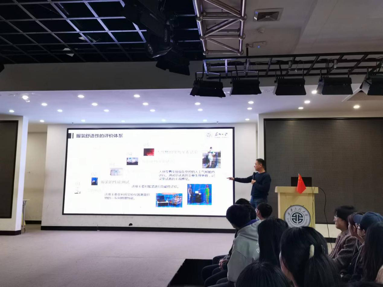 讲座伊始,系主任任军对卢业虎教授表示热烈欢迎,并向与会师生详细介绍了卢教授的专业领域和研究方向。随后,卢教授基于“环境-人体-服装”之间的关系,系统地介绍了有关服装热湿舒适性领域的理论知识和前沿动态,并围绕调温服装设计思路及其调温原理以实验案例和实测结果等多角度展开具体阐释。
