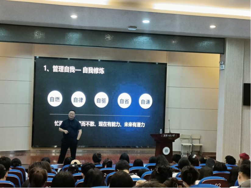 杨彬先生以自身职场经历为例,围绕“始于初心”、“忠于选择”、“重在坚持”等方面进行了生动的讲解,案例丰富、精彩实用。他鼓励同学们要进一步明晰梦想与现实的距离,学会独立思考,利用课余时间充实自己,规划好自己的大学生活,体会父母的辛苦,明白读书的意义,要领悟成长比职位更重要,能赚钱不等于值钱,想要在社会上立足,自律、自燃、自驱必不可少。