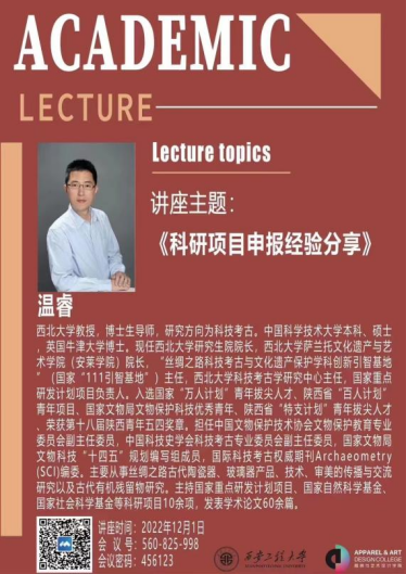 温睿 西北大学教授,博士生导师,研究方向为科技考古。中国科学技术大学本科、硕士,英国牛津大学博士。现任西北大学研究生院院长,西北大学萨兰托文化遗产与艺术学院(安莱学院)院长,“丝绸之路科技考古与文化遗产保护学科创新引智基地”(国家“111引智基地”)主任,西北大学科技考古学研究中心主任,国家重点研发计划项目负责人。入选国家“万人计划”青年拔尖人才、陕西省“百人计划”青年项目、国家文物局文物保护科技优秀青年、陕西省“特支计划”青年拔尖人才、荣获第十八届陕西青年五四奖章。担任中国文物保护技术协会文物保护教育专业委员会副主任委员,中国科技史学会科技考古专业委员会副主任委员,国家文物局文物科技“十四五”规划编写组成员,国际科技考古权威期刊Archaeometry(SCI)编委。主要从事丝绸之路古代陶瓷器、玻璃器产品、技术、审美的传播与交流研究以及古代有机残留物研究。主持国家重点研发计划项目、国家自然科学基金、国家社会科学基金等科研项目10余项,发表学术论文60余篇。