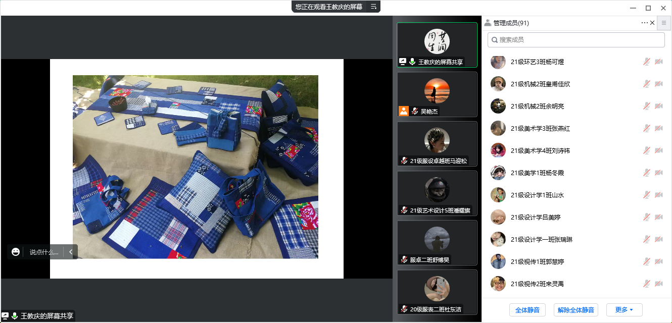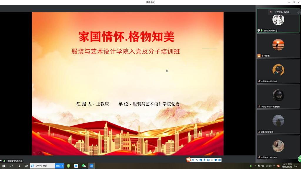 入党积极分子培训班上,院党委委员,产品设计系党支部书记王教庆副教授,通过腾讯会议做了题为“家国情怀·格物知美”的讲座,学院全体入党积极分子参加会议,副处级组织员吴艳杰主持会议。
