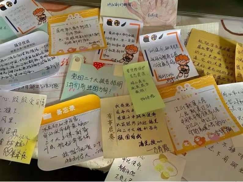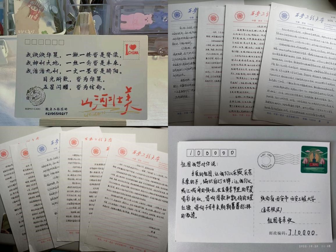 同时,部分班级同学还开展了“欢庆党的二十大,我和国旗合张影”,“纸短情长—祖国我想对你说”明信片征集等活动,来表达服院青年对党和国家的爱。
