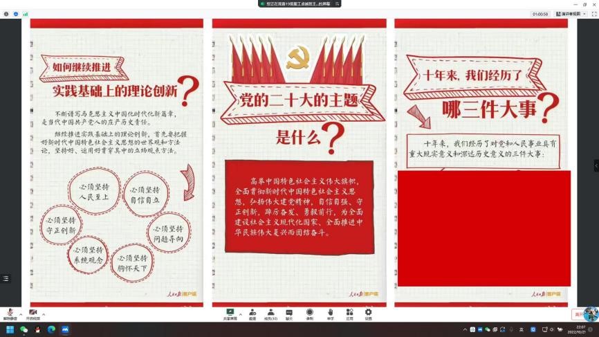 10月21日下午,19级服工卓越班于腾讯会议开展本次主题团日活动,班级通过趣味问答的方式对党的二十大开幕会报告中相关内容进行提问,加深同学们的学习印象,深刻领悟党的二十大精神,不断提高思想认识,强化责任担当。