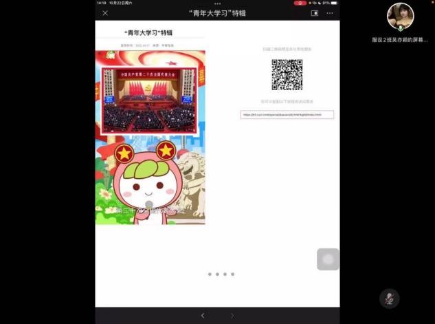 10月22日中午,21级服设02班在腾讯会议线上开展本次主题团日活动,团支书吴亦颖介绍此次活动的背景,她谈到:“我们要深刻感悟新时代党和国家事业发展的伟大成就,以昂扬姿态坚定跟党走,奋进新征程,建功新时代,以优异的成绩迎接党的二十大胜利召开”。心理委员徐佳蕊为大家做学习分享,她鼓励同学们作为新时代青年,要做到习近平总书记提出的“五个牢牢把握”,把党的二十大精神落到实处;要深谙“新长征路上有风有雨是常态,风雨兼程是状态”的道理;在学习与生活中,砥砺“越是艰险越向前”的品格。最后团支书带领全班同学重温“青年大学习”特辑,以史为鉴,开创未来,埋头苦干,勇毅前行,争做有理想、敢担当、能吃苦、肯奋斗的新时代好青年。