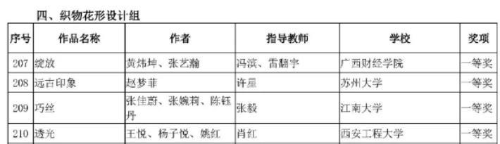 产品设计系学生共获得各组别奖项47个,其中2018级产品设计专业王悦、杨子悦、姚红同学合作的作品《透光》荣获织物花型设计组一等奖,李珂妍等多名同学荣获纤维艺术与材料再造设计组一等奖7项,其他同学各获二等奖17项、三等奖22项。肖红、徐训鑫、张静、王晓霞、陈华、罗夏艳、王育新老师在本次大赛中荣获优秀指导教师称号,同时本校也荣获大赛最佳组织单位奖排名第一的殊荣。