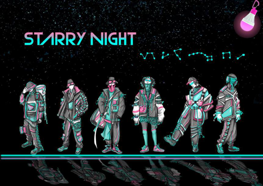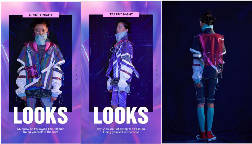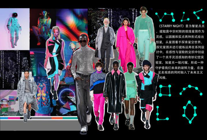 个人作品简介:以《唐.未央》是本次毕业设计的大主题,未,无;央;尽,尽头。未央:未完、待续、无边无际之意。《starry night》意为繁星点点,提取唐中宗时期的敦煌星图作为灵感,以圆圈和实点两种形式绘出恒星,从星图着手探索星空世界,探究星图并进行提炼运用在系列设计中。运用智能led冷光线与编织和面料绘画星图进行再造,穿梭在古代与未来时空中,在感性与冒险的交织中创设了一个关乎灵活感知的奇妙幻觉实验室。如星光一般闪耀,形成一种守护着我们未来的新鲜力量,在满足美观感的同时融入了未来主义风格。