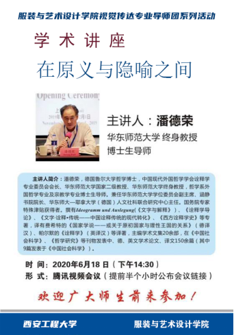 视觉传达专业合力育人导师团积极组织本专业学生于6月18日14:30开展线上学习,聆听了华东师范大学终身教授、博士生导师潘德荣网络线上学术讲座《在原义与隐喻之间》,视觉传达专业约80余名同学观看了讲座直播。