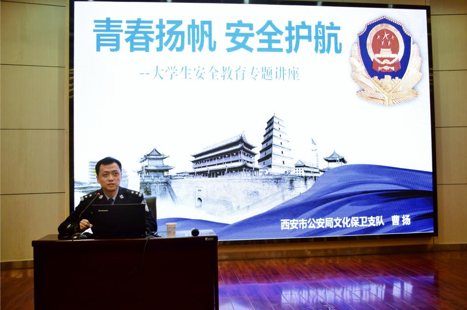 大学生安全教育讲座在金花校区举行。讲座特邀西安市公安局文化保卫支队四大队副大队长曹扬警官以“青春扬帆·安全护航”为题为向大学生进行了安全教育。本次讲座是学生工作部和韩h漫