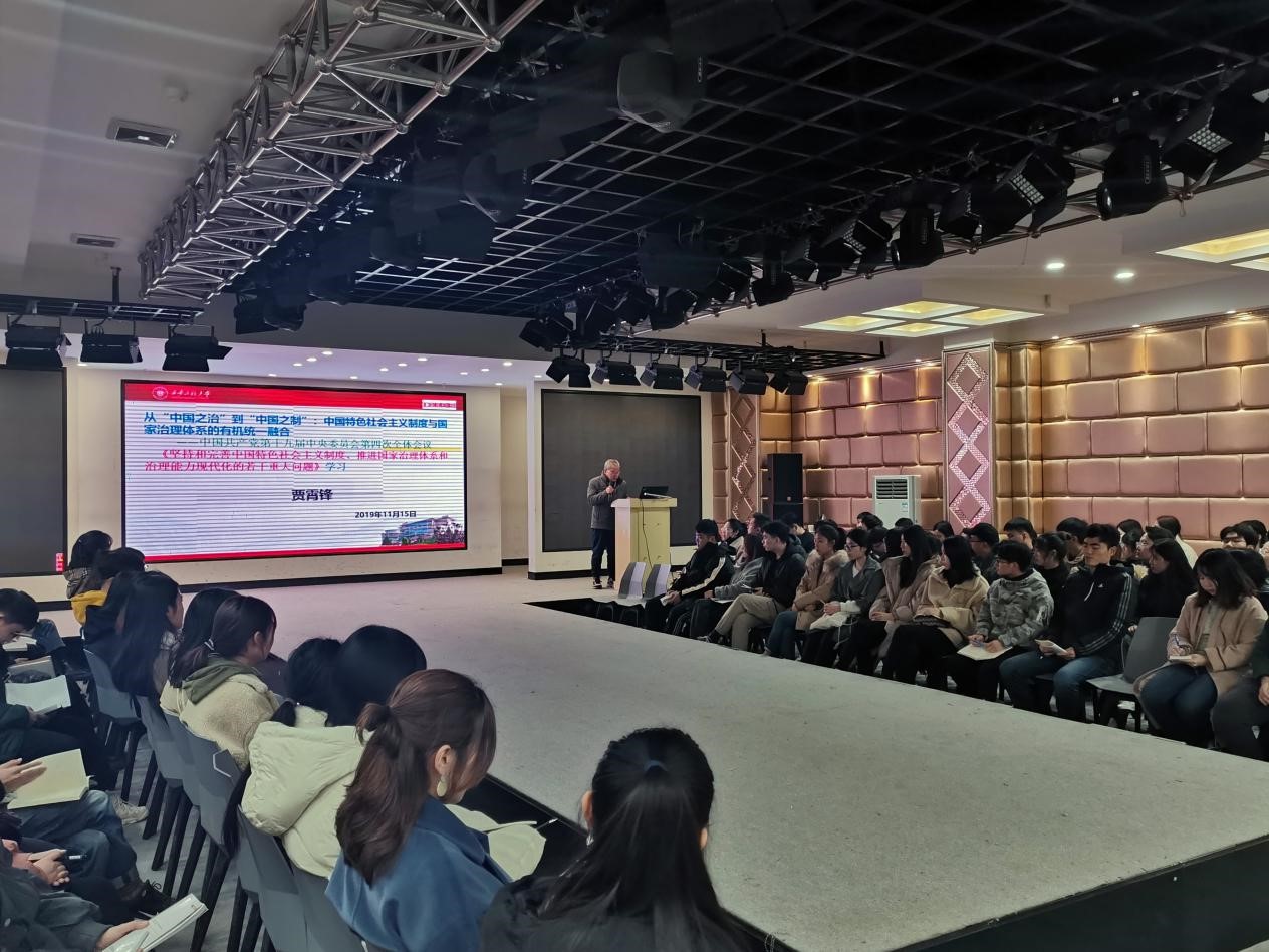 贾霄锋教授围绕中国特色社会主义制度与国家治理体系的融合,紧扣“坚持和完善中国特色社会主义制度、推进国家治理体系和治理能力现代化”主题,对十九届四中全会《决定》进行深入解读。讲述了制度建设的重要性和必要性。同时回顾了我国重大的历史节点:从鸦片战争到新中国成立,从改革开放到新时代,我国取得了重大成就,实现了经济快速发展、社会长期稳定的“两大奇迹”,和中华民族从站起来、富起来到强起来的伟大飞跃。解读了加强社会治理制度建设,完善党委领导、政府负责、社会协同、公众参与、法治保障的社会治理体制。总结了我国社会治理的经验,强调打造共建共治共享的社会治理格局。