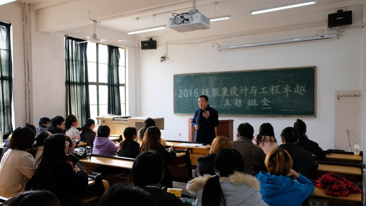 2016级服装设计与工程卓越班主题班会。高岭寄语毕业生,要结合自身实际,冷静分析、精准定位,最大限度的去发挥自己的长处与优势,做最适合自己的事。