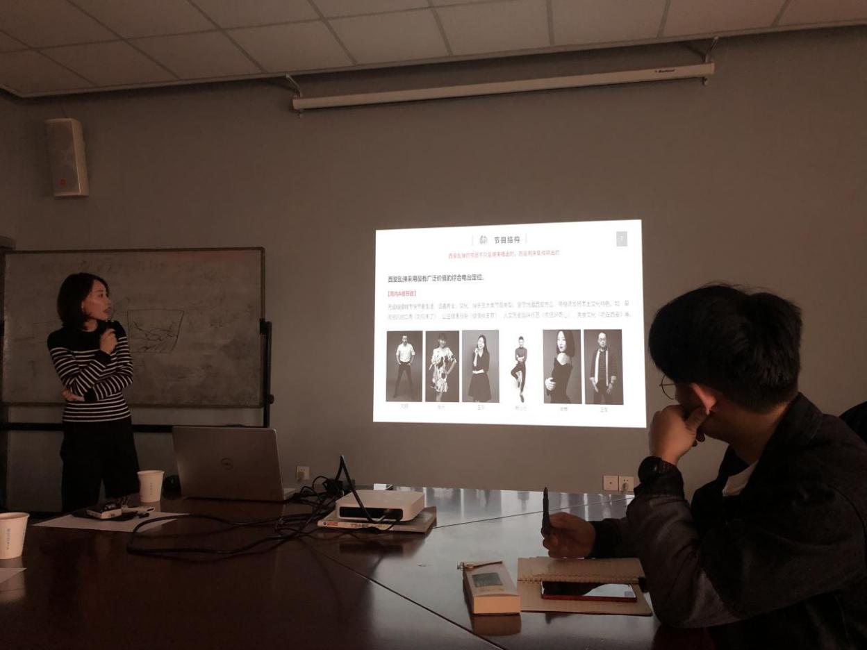 首先,副总监周老师就“西安乱弹”栏目的互联网平台及“新西安乱弹”微信公众平台运营情况做了简单介绍。她从影视与视觉营销、文化演出营销、美食文化媒体营销及亲子产业营销四个板块来进行介绍栏目的营销模式,其主要以影视制作为主要方式,将节目故事化并进行影视化拍摄,或采用直播方式,利用西安本地风土文化及唱作作品,融合媒体平台并进行推广宣传。周老师并为学生展示了部分作品案例。接着李总监一行与同学们进行了专业交流,对学生的作品、作业进行了深度探讨,并给出了中肯的建议。