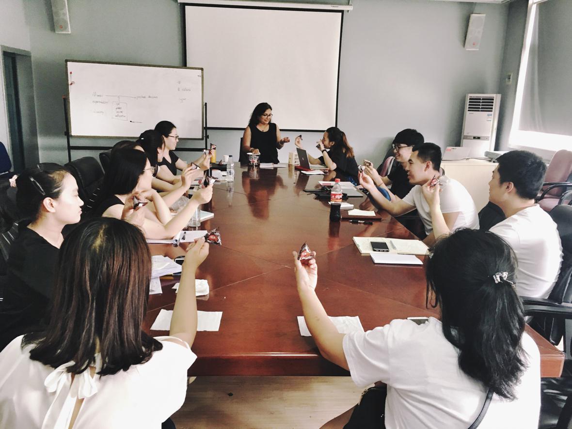 面对课堂上来自每位学生和老师不同领域的课题,Uma老师为了能够更好的帮助大家厘清思路,她占用自己休息的时间,积极的查阅各种文献书籍资料,对本来较为陌生的领域进行自学,这令每一位参加这门课程的同学和老师都非常的触动。正如听课老师所言:她教会了我们按照规划研究的顺序,从明确主题到确定变量模型,从选定研究方法到文字报告撰写,逻辑鲜明稳扎稳打,不但为大家勾勒出完整的学术研究框架,还具体的结合每个人的选题进行了深入细致的探讨。同时, Uma老师轻松活跃的课堂氛围、有趣易懂的游戏方式来解读抽象的学术概念,使得学生积极参与到课堂教学当中,从而顺利帮助他们解决研究难点和问题。让参与的教师与学生对现在研究的课题方向变得更加的清晰可见,更加有调理,对以后的研究分析变得更加容易有高效。参与上课的研究生如是形容: “在学习如何做研究方面, Uma老师对于学术研究严谨认真的态度,让我很有感触,无论我们是在哪个国家,在任何领域做研究,这种态度都是必须要贯彻的。同时,她教会了我们如何阅读文献,提出课题,构建模型,选用何种研究方法以及进行何种类型的数据分析,最后如何去撰写论文。每一步都给我们每个人充足的时间去思考并与她讨论,小到每一个用词,都与我们商榷。”