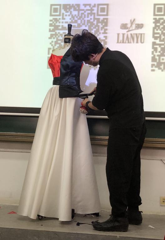 同时此次培训邀请“莲御”婚纱礼服创始人——朱盺有进行立裁技巧培训,在简要介绍了品牌“莲御”并展示工作室一些作品后,朱老师随即进行立裁现场教学,为我们演示了婚纱礼服和迪奥经典西服的制作。教学演示之后,进入现场提问环节,朱老师在回答了同学们所提的问题的同时,与系主任袁老师在立裁上进行经验交流,帮助同学们掌握了更多的立裁知识。