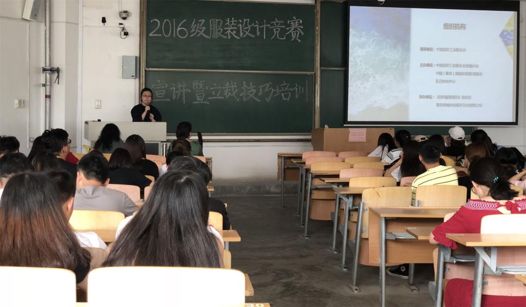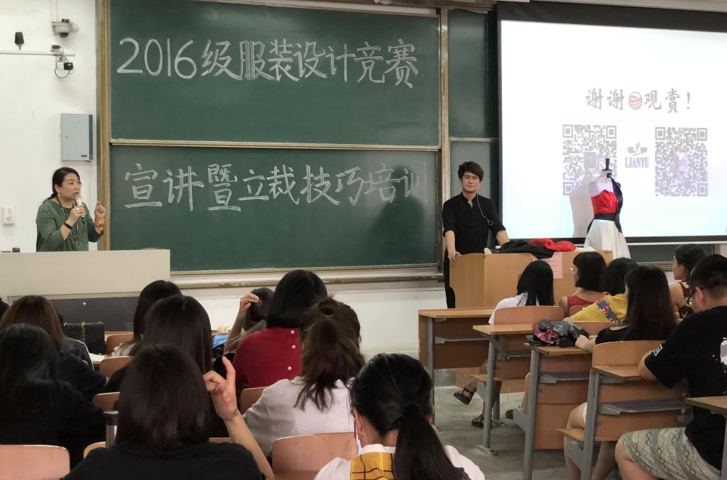于2018年6月27日下午14:30在临潼校区B-337教室组织召开2016级服装设计竞赛宣讲暨立裁技巧培训,中国纺织工业联合会郭也可、孙洁、“莲御”婚纱礼服创始人朱盺有、学院服装设计系主任袁燕、学院团总支书记马薏雯参加此次宣讲培训。同时出席的还有2016级服装相关专业全体学生。此次培训在袁燕的主持下顺利召开。