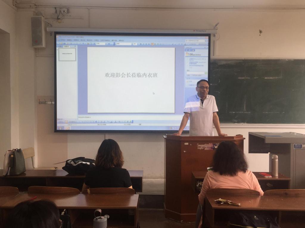 内衣系主任刘驰教授向大家介绍了彭桂福会长,内衣系师生表示热烈欢迎。彭桂福先生目前是中国纺织品商业协会副会长、中纺协内衣委员会会长、中国商业文化研究会理事、婚纱礼服委员会会长、国家安全生产标准化技术委员会委员等。