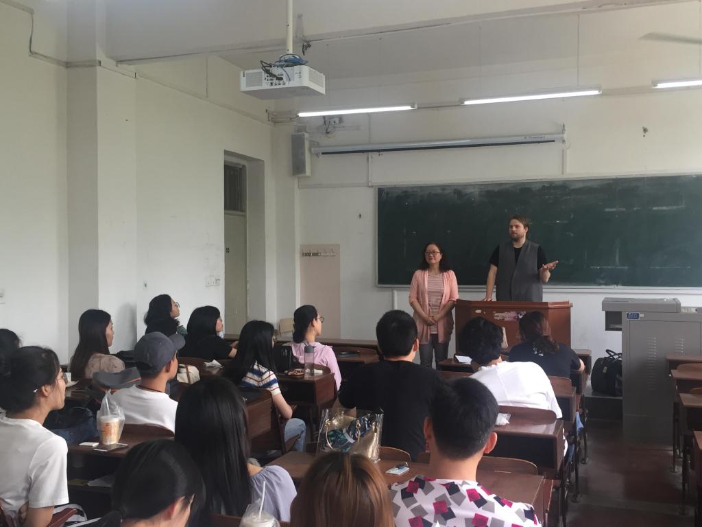 内衣系主任刘驰教授介绍了纽约帕森斯学Jasonpaul McCarthy教授,同学们表示热烈欢迎。