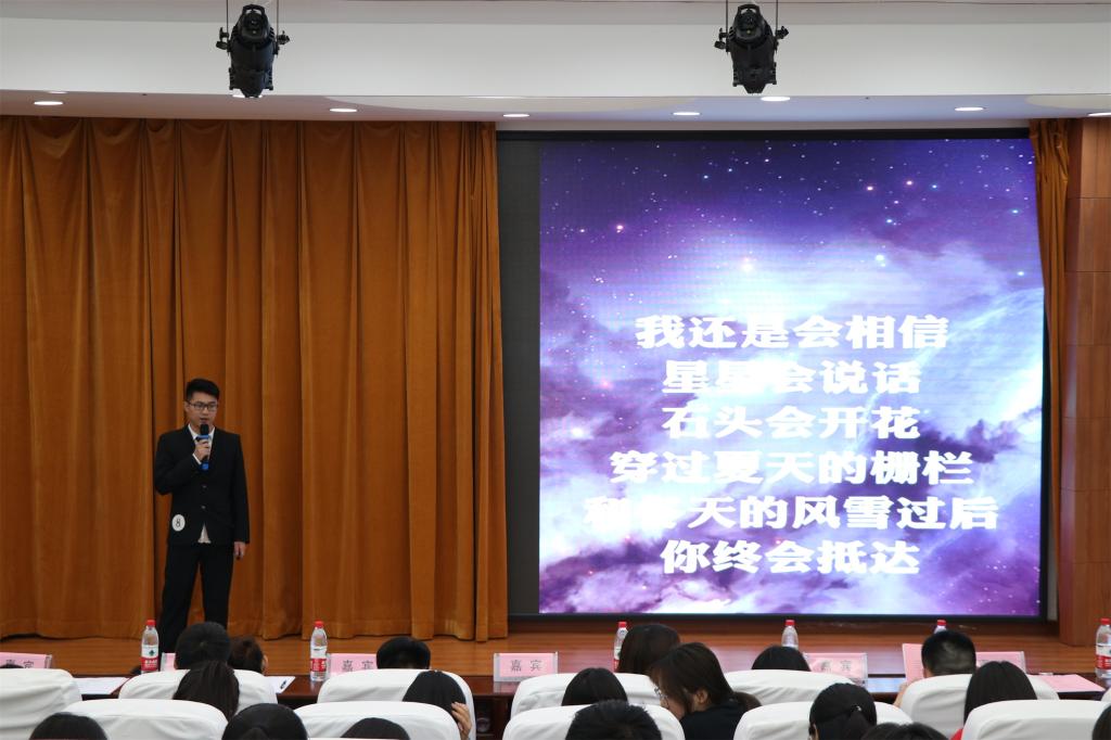 主席团代表刘阳为本次比赛开场致词。在致词中他提到,才能是我们人生中最宝贵的财富,是金子总会发光,每一次机会都是为我们最后的成功做铺垫,愿同学坚定信念,为梦想扬帆。讲话完毕,主持人宣读本次比赛的奖项标准、内容要求、评分方法等规则后,演讲比赛正式开始。