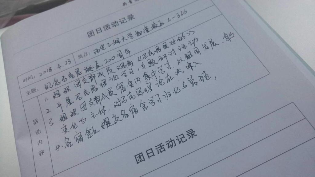 团总支积极指导开展的“纪念马克思诞辰200周年”主题团日活动,以宣讲讨论、观看影片、阅读著作等一系列灵活有趣的形式将马克思理论从晦涩难懂的书本带到了生活中,帮助广大团员青年深入的了解了马克思的生平事迹与其伟大思想,使全院学生进一步坚定了理想信念。随后,各团支部将认真填写的团支部活动记录本上交团总支进行检查。