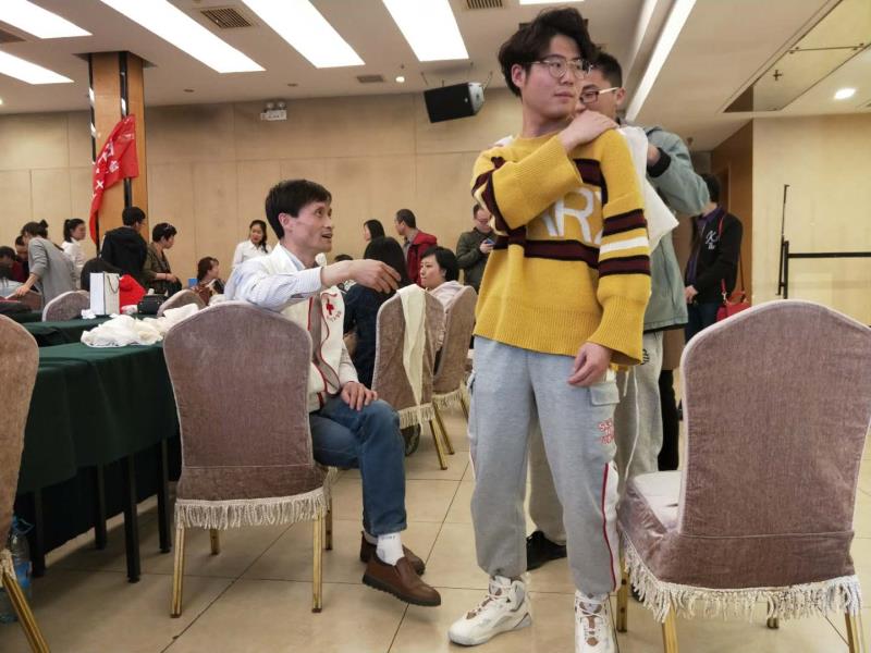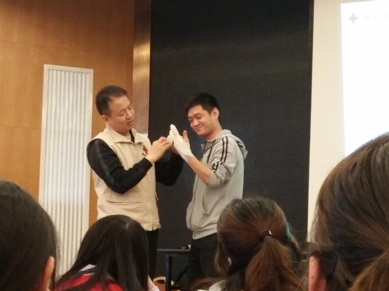 次日,课程的学习内容为“创伤救护”,主要分为为绷带与三角巾的使用方法、骨折固定以及现场包扎技术的学习与应用三个方面。学习现场,指导老师向学员们展示了十几种简单、快捷、实用的包扎方法。随后,学员们两两一组互相进行实体实践,但真正自己动手做的时候,学员们发现老师轻松做出来的动作并不简单,其中蕴含着多种技巧与多年积累的经验。最后,为了检测两天内大家的学习成果,学生们进行了一场笔试并取得良好成绩。