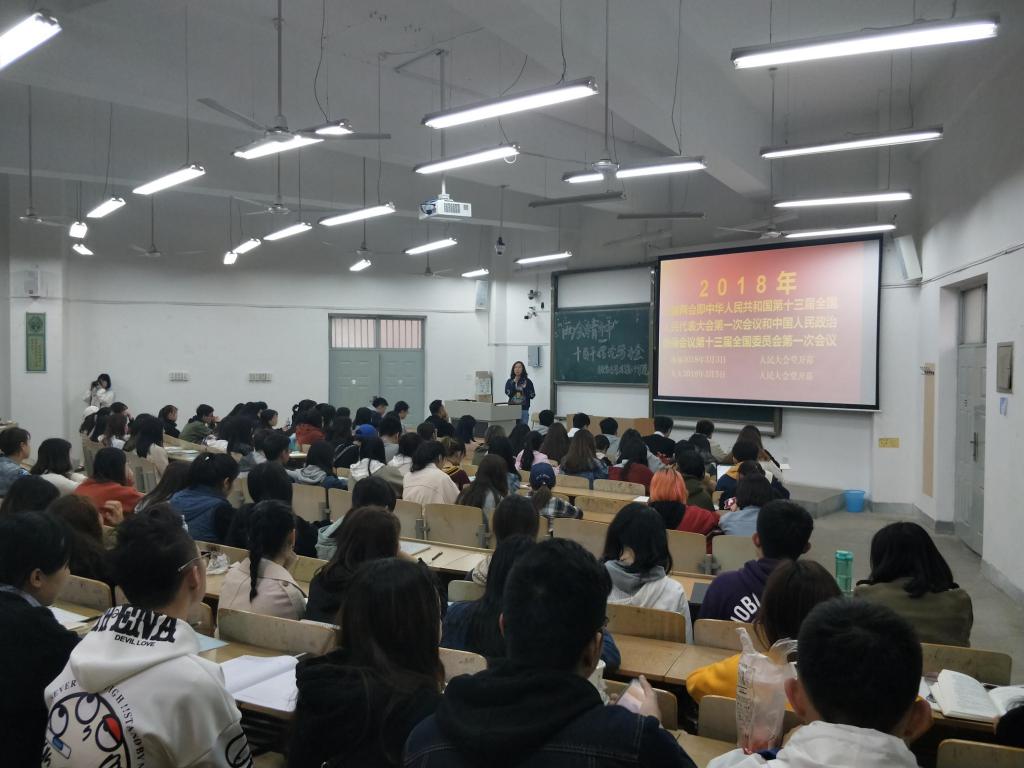 团总支3月23日中午在临潼校区B栋教学楼135教室召开传达以“学习两会内容,传达两会精神”为主题的十百千理论学习会。院团总支书记马薏雯、辅导员邵巍、王丽丽、邢烜毓,2016、2017级各班团支书、组织委员等200余人参加了本次学习。