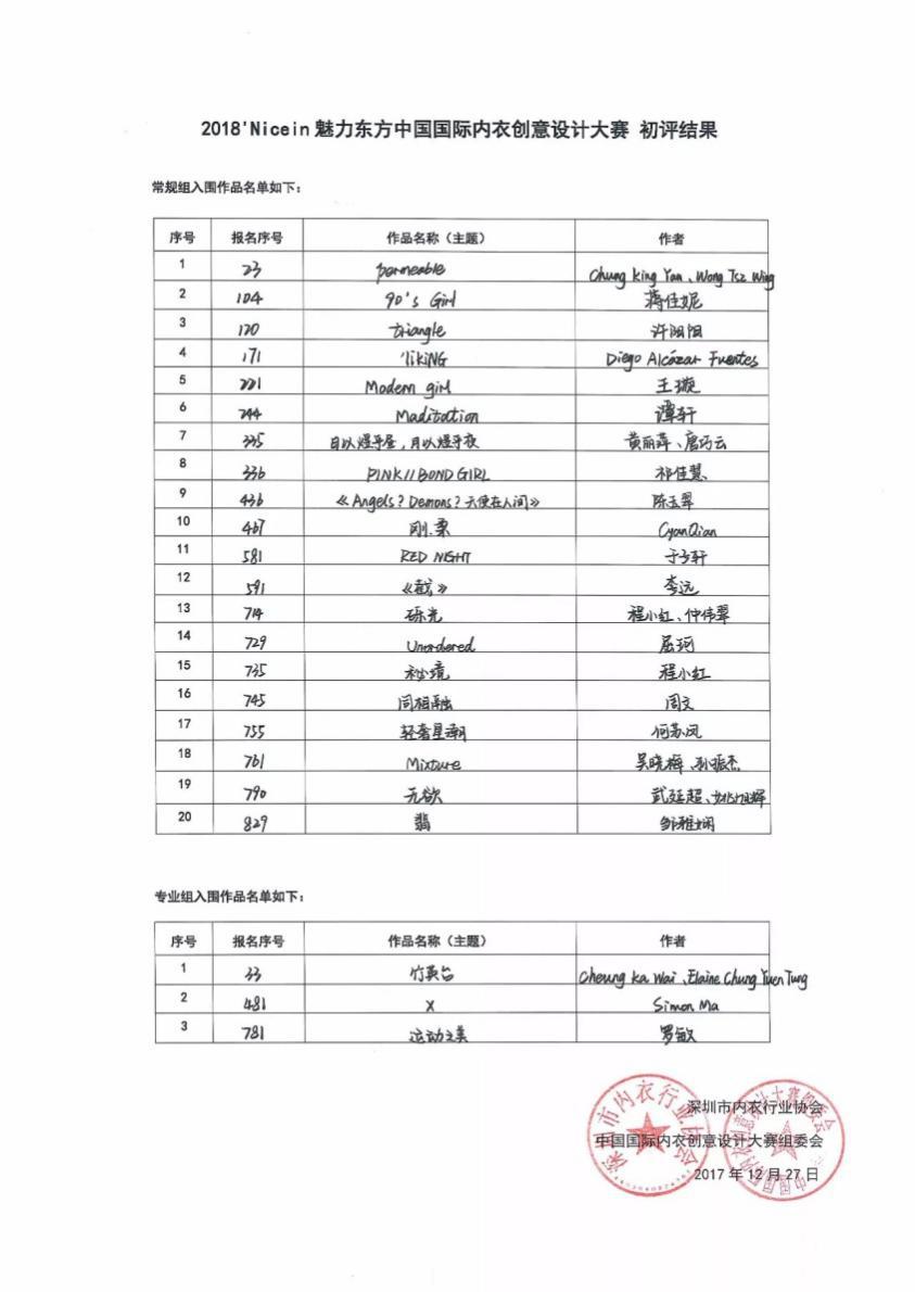 2017年12月27日,2018’Nice in魅力东方中国国际内衣创意设计大赛初评在深圳市光明新区会展中心圆满举行。经过专家评审团以“公平、公正、公开”的原则进行层层筛选,20副常规组作品及3副专业组作品最终脱颖而出,入围2018年4月的总决赛。韩h漫