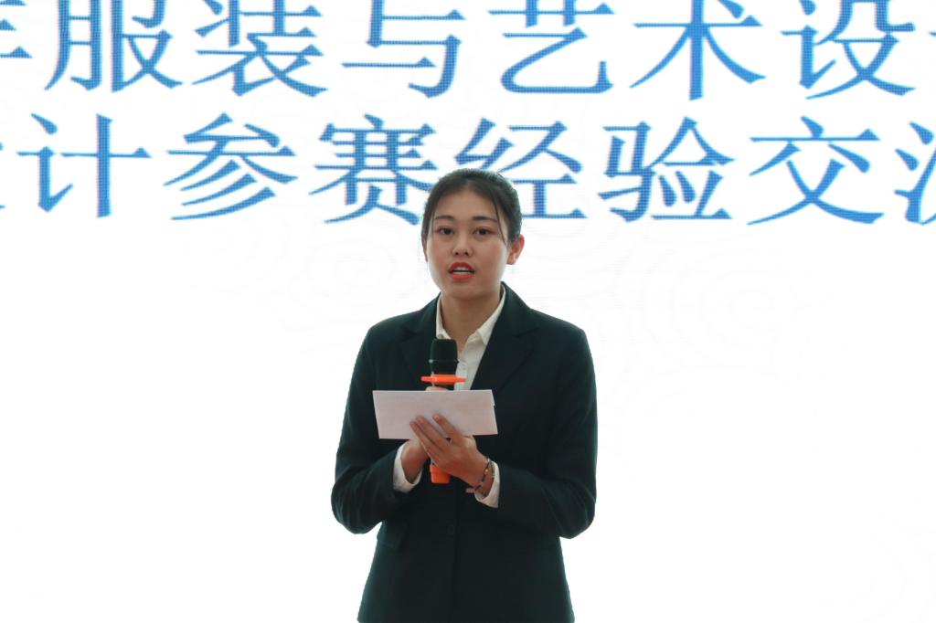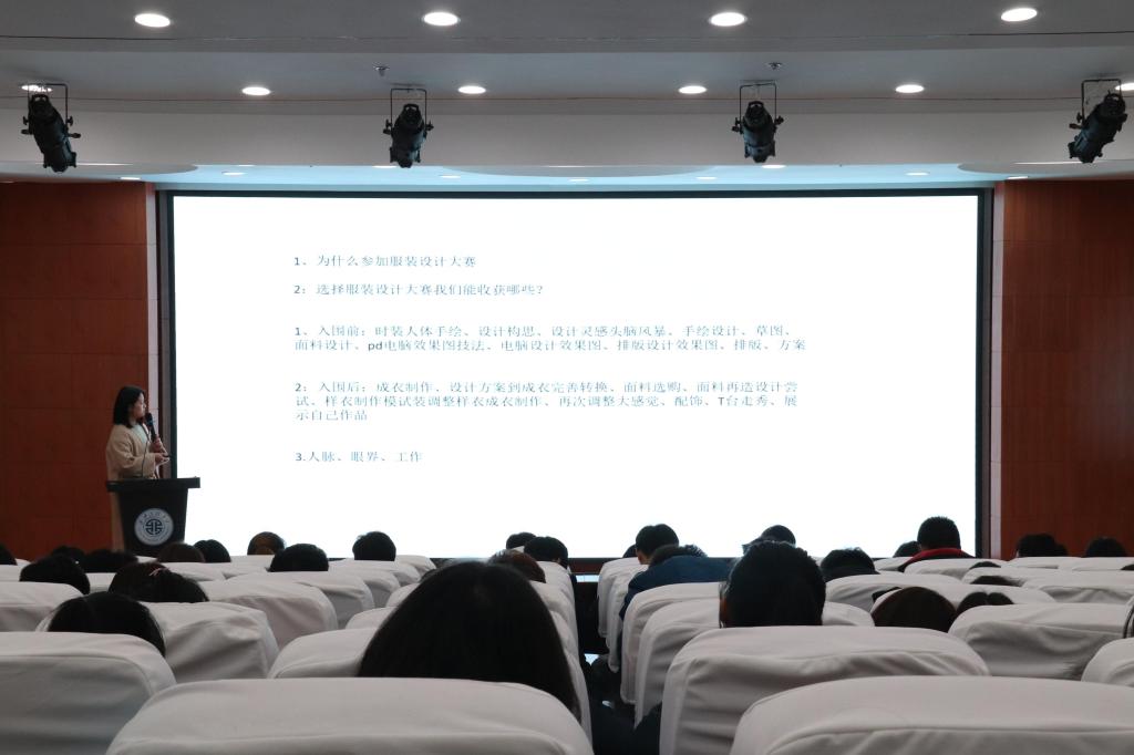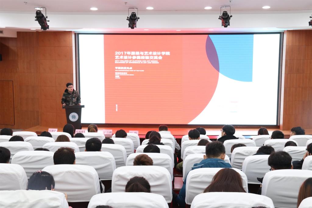 四位同学分别从视觉传达设计、服装艺术设计、针织艺术设计、摄影等方面相关的专业知识展开介绍,同时对当下的创意、流行元素、设计风格和表现形式以及参赛作品的竞争力等方面进行详细的解读。其中,刘阳指出,如何提高平面设计作品的视觉冲击了和社会热点问题的体现、作品完整性是参赛获奖的关键。随后来自针织专业的王玮麟对关于针织方面的专业问题及参赛经验做了介绍并介绍了许多的选素材的途径。最后,服装艺术设计专业的程雅璇和摄影专业的刘康奇对相关的参赛经验做了交流,同时指出,设计作品要中西合璧能更吸引评委,是参赛获奖的关键。
