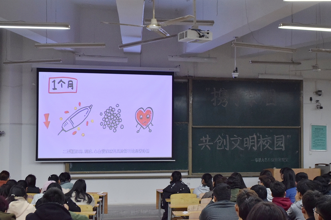 各个宿舍进行了禁烟宣传,并在当天晚上于b栋教学楼播放了禁烟宣传片,更加全面、立体、形象的向同学们展现了吸烟的危害,使“禁烟”这一观念更加深入到同学们的心中。16日,志愿者们向学生宿舍楼统一发放了禁烟活动调查问卷,了解了广大同学们对“吸烟与禁烟”的看法,以便于获得更多的活动反馈。20日中午,在校中心广场播放的禁烟采访视频,因屏幕电视申报故障而推迟。