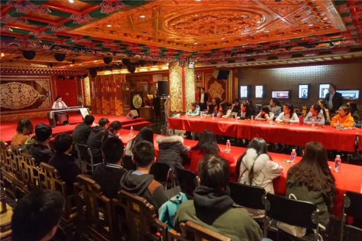 愉快的调研活动结束之后,师生们齐聚亮宝楼文化艺术大厅欣赏了古琴弹奏《流水》,“创所欲言——创意思维碰撞汇”的课程交流和研讨活动正式开始。首先,李经理就亮宝楼内装修风格、木刻石刻技艺以及文物藏品的图案形状等元素与师生进行了探讨和交流,接着对蚂蚁部落研学项目进行了详细介绍。师生们基于对亮宝楼的初步调研以及自身专业的知识积累,对亮宝楼的传统文化推广提出了许多新的思路,比如充分利用3D科技提高顾客的参与度和体验感、利用视频直播提高亮宝楼艺术展的辐射范围和力度、利用VR技术增加艺术品的可视感、通过服饰文化交流活动传播传统文化等等。参会的雷老师还提及了汉服的史料复原和传承项目,以及汉服的基本结构和制作工艺,令在场师生和工作人员了解到很多与汉服有关的专业知识。整个交流过程中,大家畅所欲言,现场气氛异常活跃。