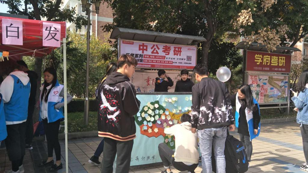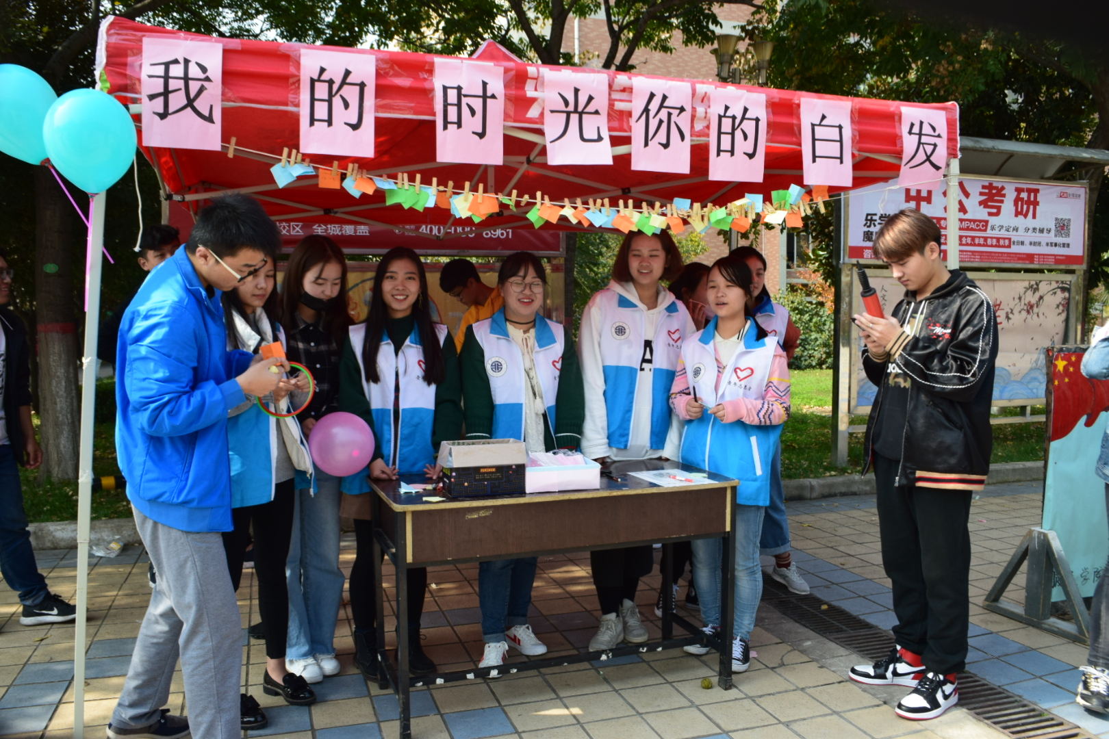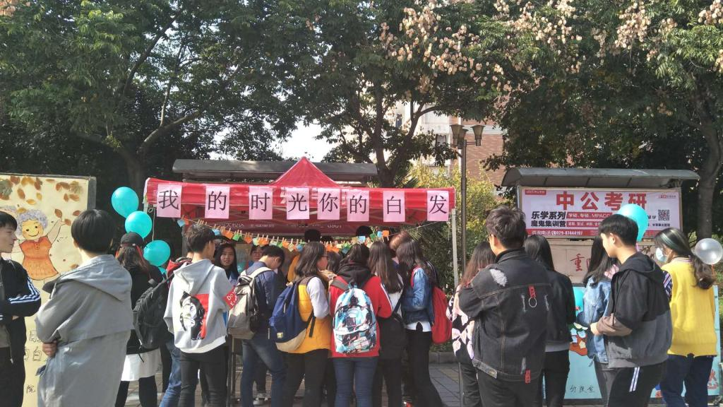 于10月27日中午,重阳节到来前夕,在临潼校区中心广场开展了以“我的时光,你的白发”为主题的爱校日宣传活动。本次活动由韩h漫
