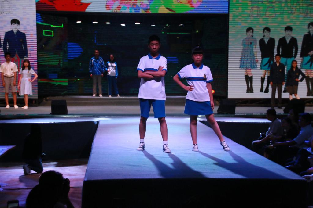 本次大赛从今年三月份启动,共收到全市校服设计稿件425份,其中小学组153份,中学组272份。大赛组委会于6月22日举行了初赛评审工作,最终推选出小学组25个系列作品、中学组25个系列作品进入决赛。决赛开始前,有44组选手完成了样品制作:其中小学组21个系列、中学组23个系列(每个系列有男、女生夏季、春秋季、冬季校服共6套组成)。总决赛上展示了选手们制作的中小学校服作品,其中不乏有英伦范儿、韩国范儿的校服,也有体现汉唐文化的校服,还有能引起八零后集体回忆的《Li 雷与韩梅梅》——白色衬衫短袖、蓝色背带裙,满满的年代感。