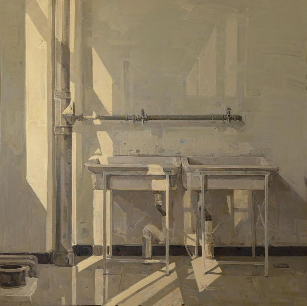 《阳光下的记忆》是李春山于2016年1月所创作完成的。画面内容取材于学校工训中心5楼的教室一角,窗户边略显老旧的洗手池在光线的照射下变得斑驳而有秩序,这不仅是他生活中的一个片段,更是他们一批批艺术生的集体记忆。其中,宁静的光线处理不仅强化了画面的构成美感,更让他们的记忆变得永恒而又清晰。