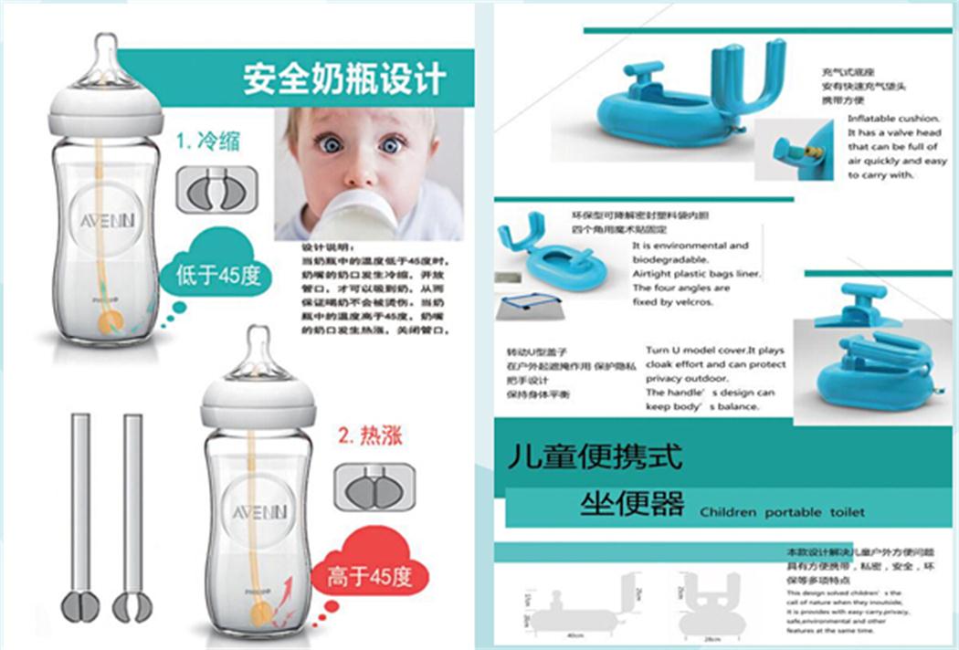 产品设计系多组作品获奖:郑婷丹的《儿童便携式坐便器》获陕西省一等奖,并入选全国,获全国优秀奖;范凯贤、张瑞、姜晨的《安全奶瓶设计》获陕西省一等奖,并入选全国;周鹏的《便携式纸杯设计》、王涛的《新生-手杖凳》,杜卓、王涛的《Through your eyes》,王贺琦的《匠心》,周鹏的《灯具设计》等5部作品获得省级优秀奖。