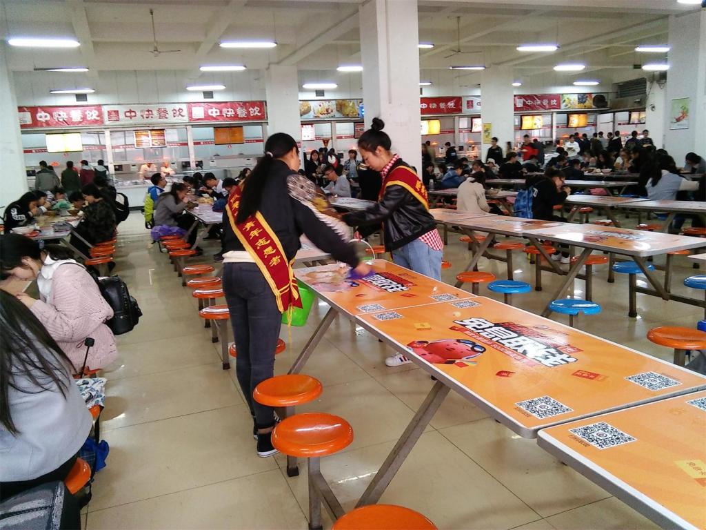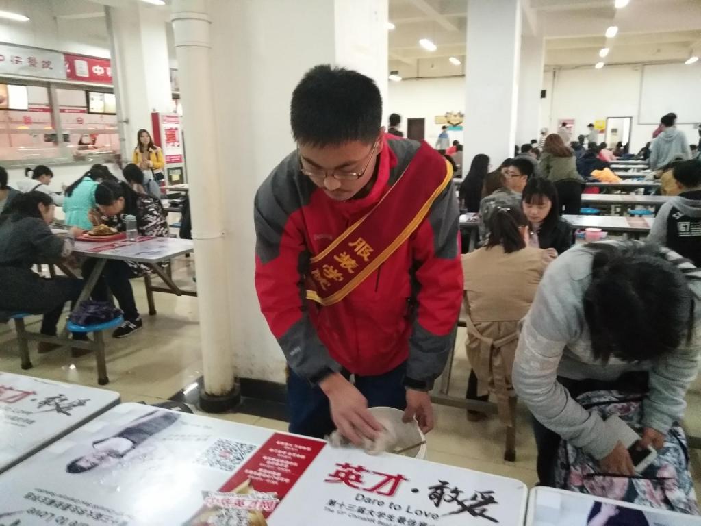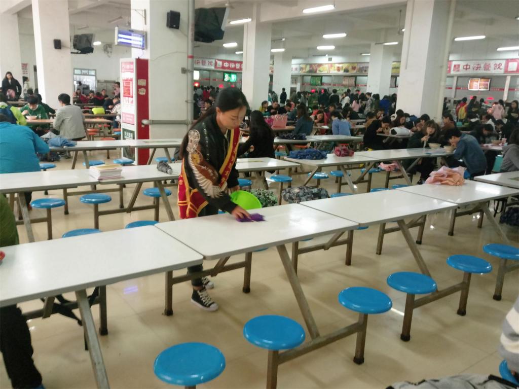 执勤时间为每日中午12点至12点30,下午6点至6点30。活动场地为食堂一二三层,每组5人,由青分队成员带领并分发绶带。志愿活动期间志愿者帮忙整理未端走餐盘,整理桌子,并且举止礼貌的帮助清洁阿姨完成清洁工作。展现了韩h漫