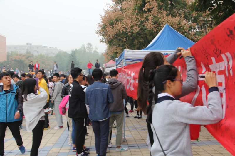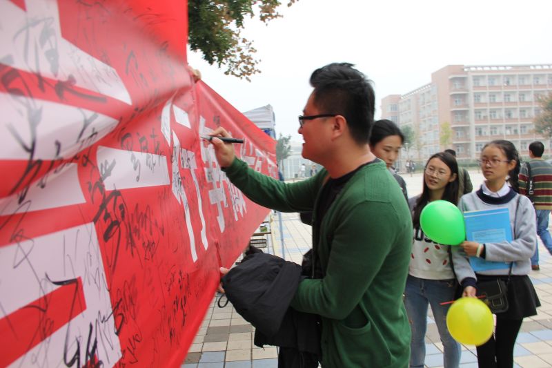 团总支随后于学校中心广场西侧举办了的争做“六有”大学生签字宣传活动,学生干部们拉起写着活动标题的横幅,并放置好精心绘制的海报。活动过程中,现场参加的同学们积极地在横幅上签下了自己的名字,带动了更多路过的同学们参加活动。
