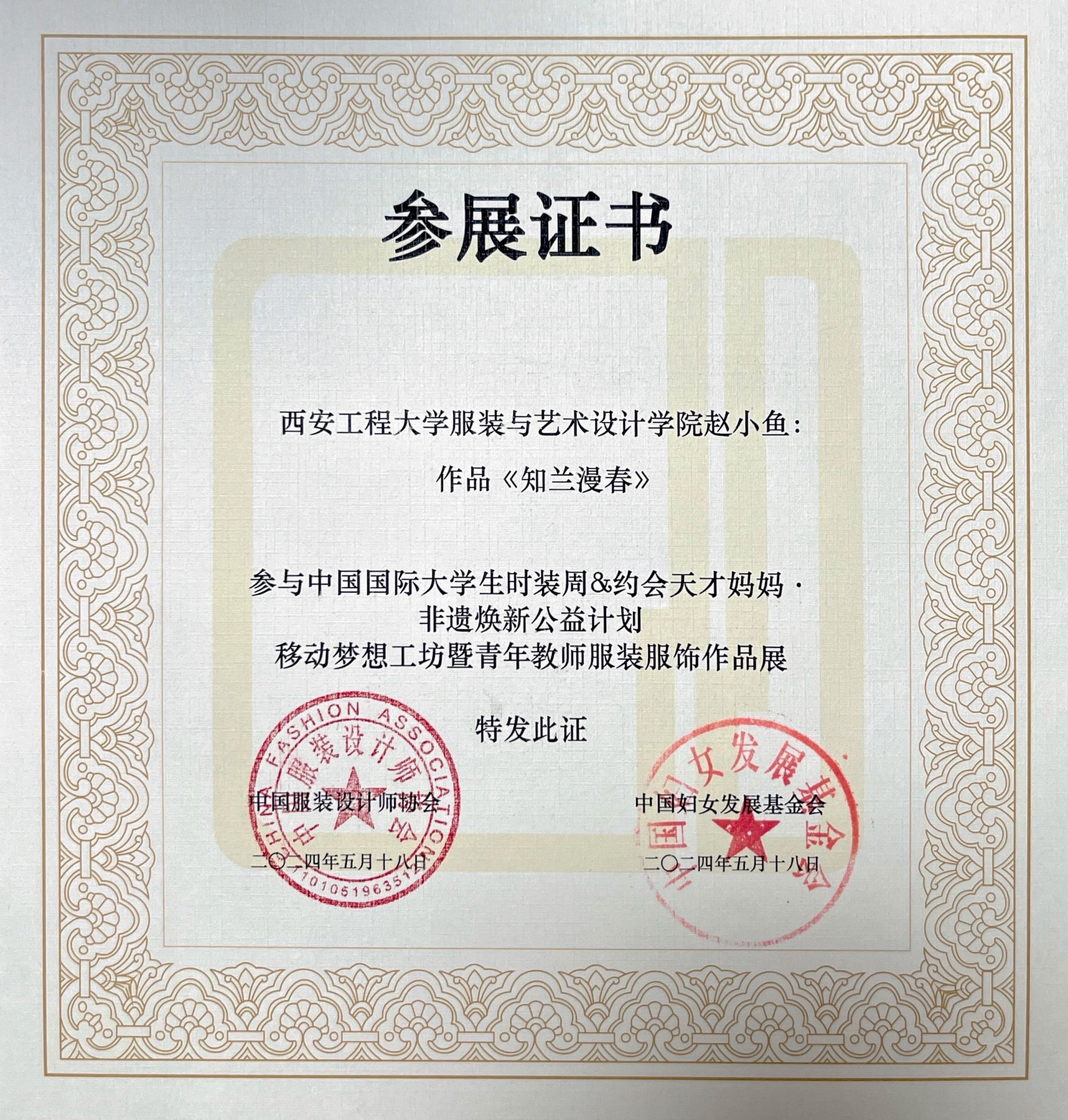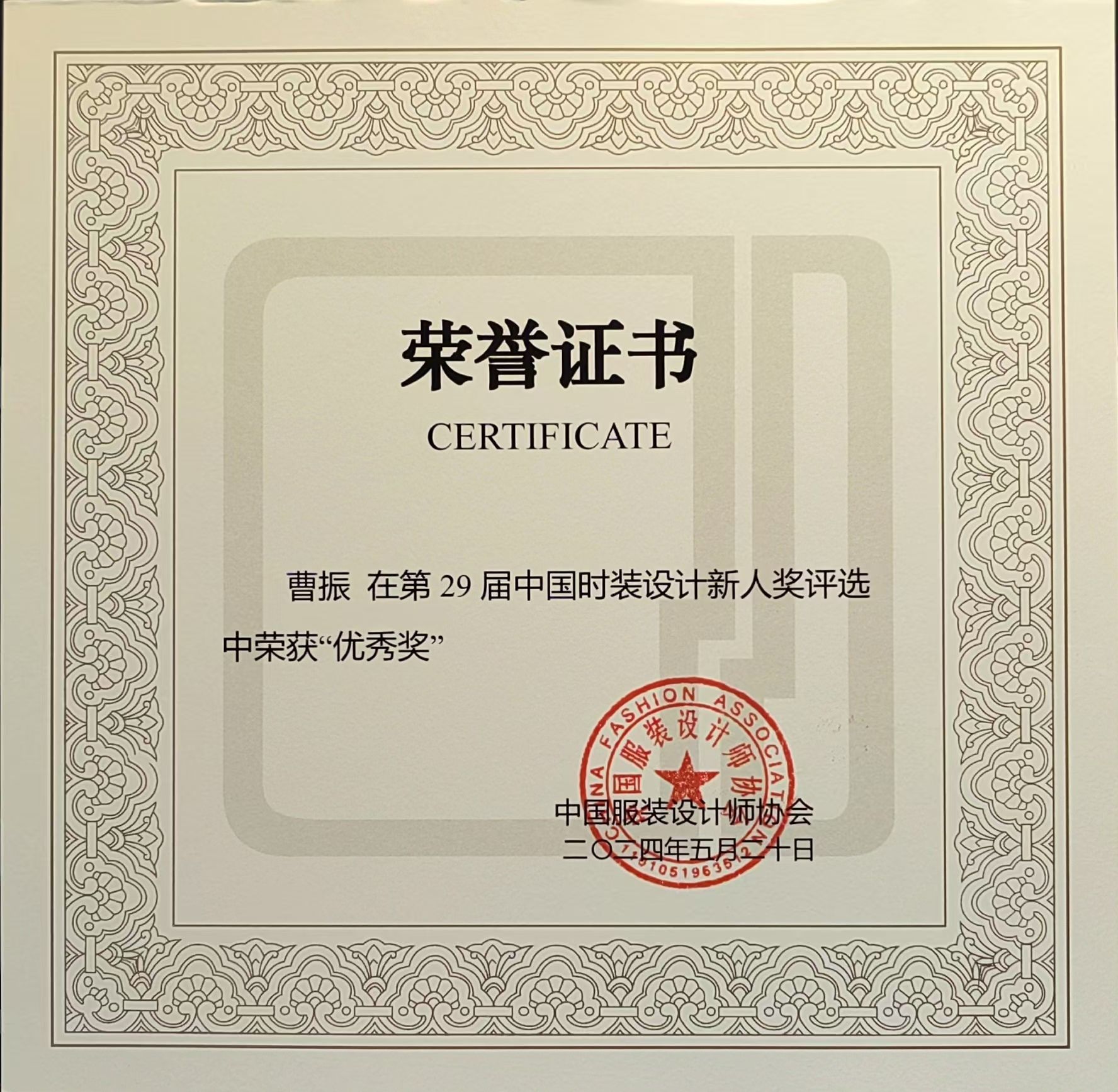 荣获“2024中国国际大学生时装周人才培养成果奖”,2020级服装与服饰设计卓越班熊子傲同学荣获工艺制作奖,2020级服装与服饰设计3班曹振同学荣获“第29届中国时装设计新人奖评选优秀奖”。