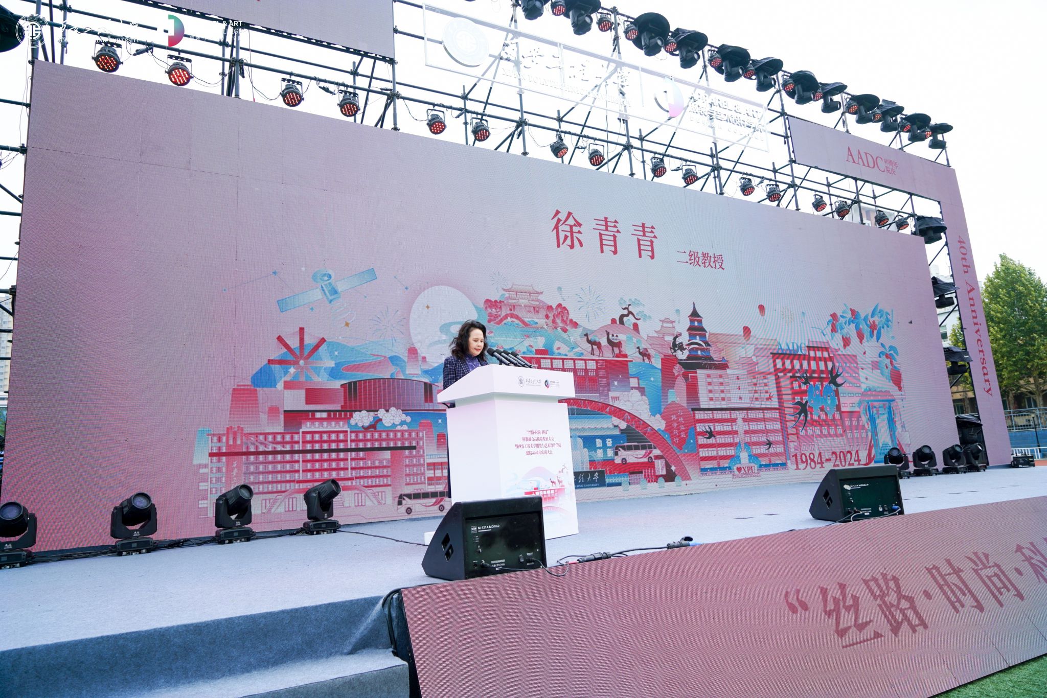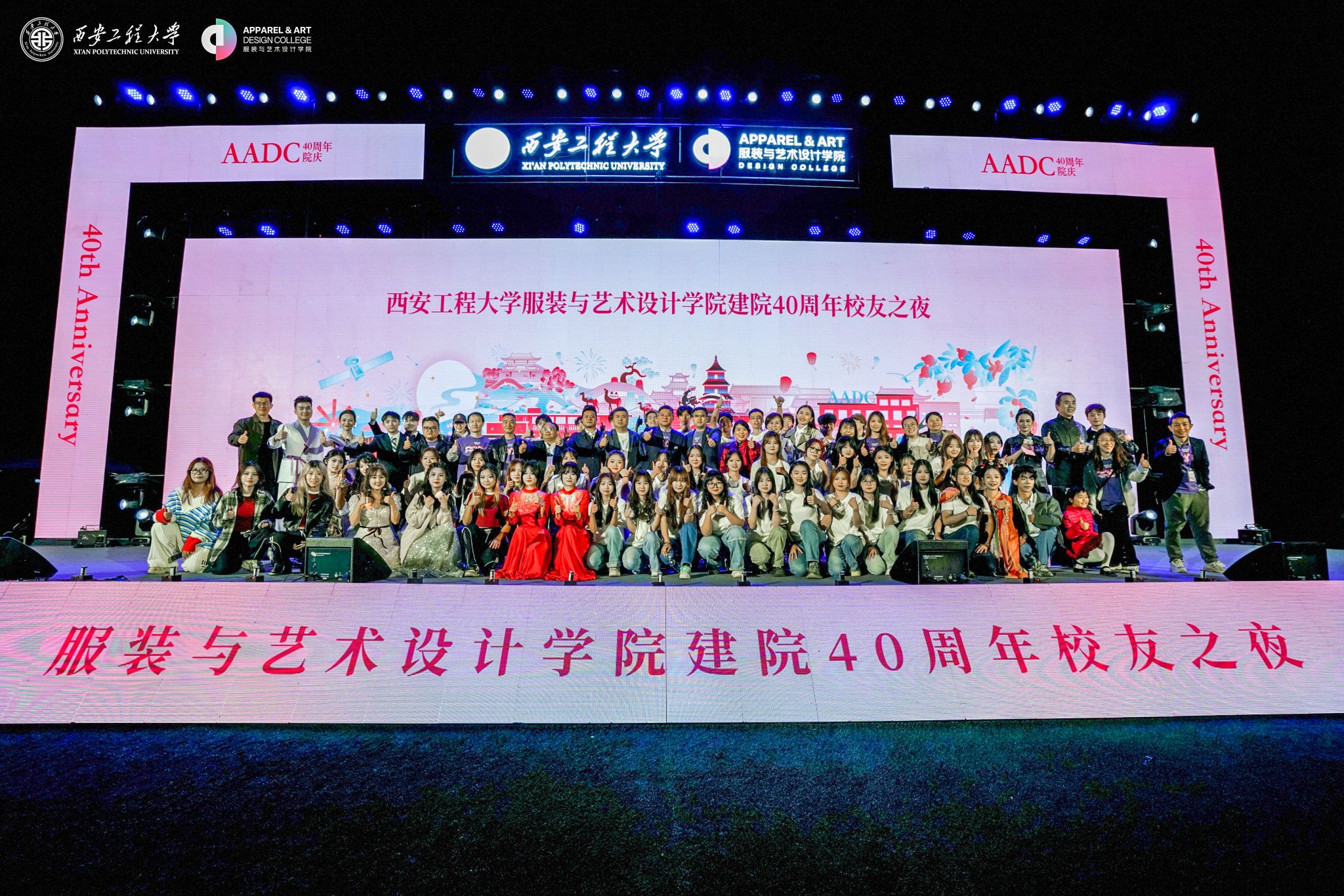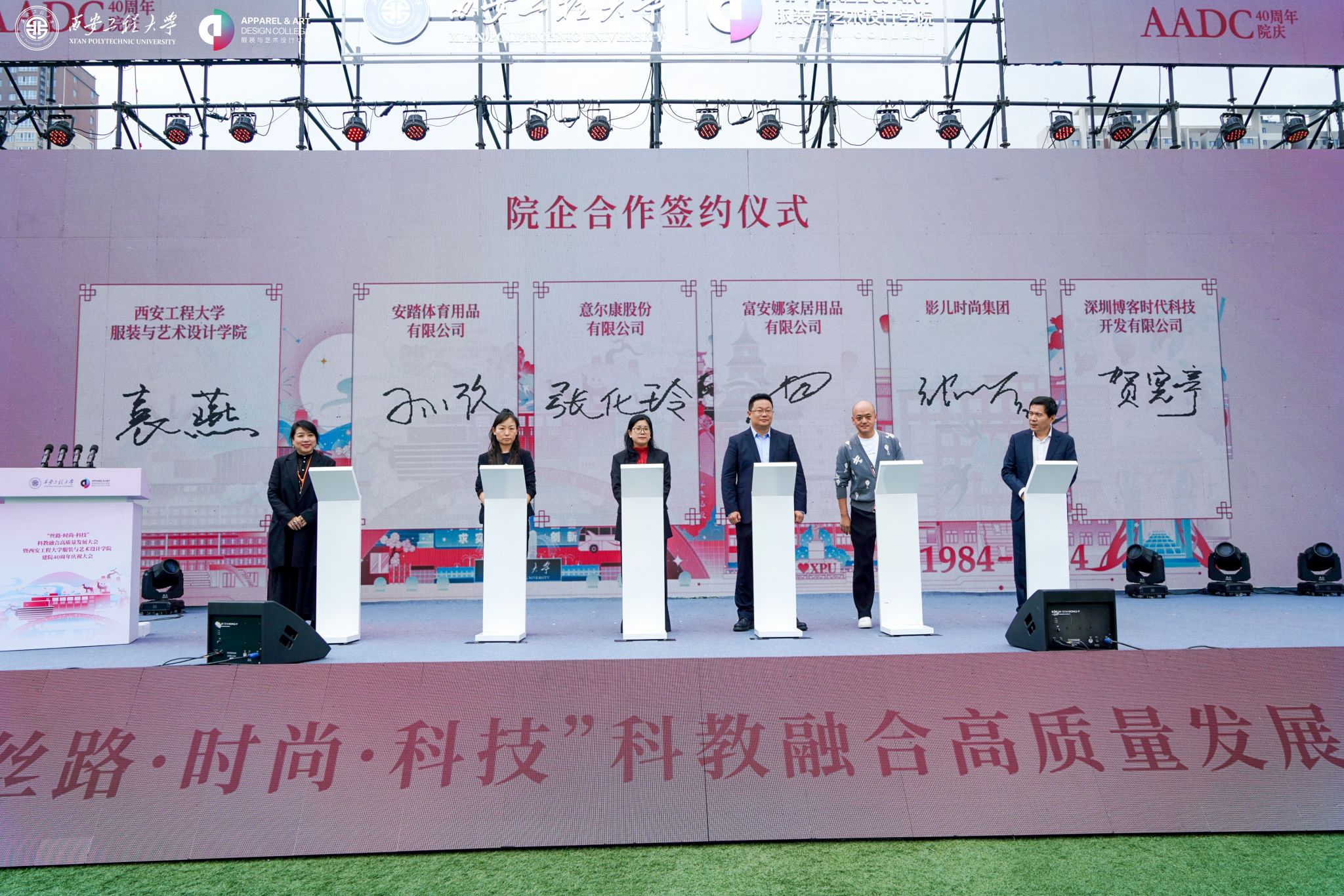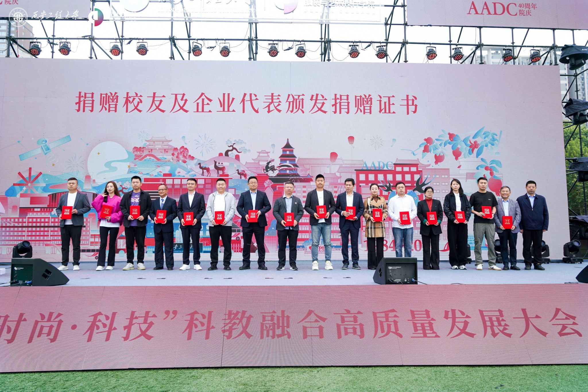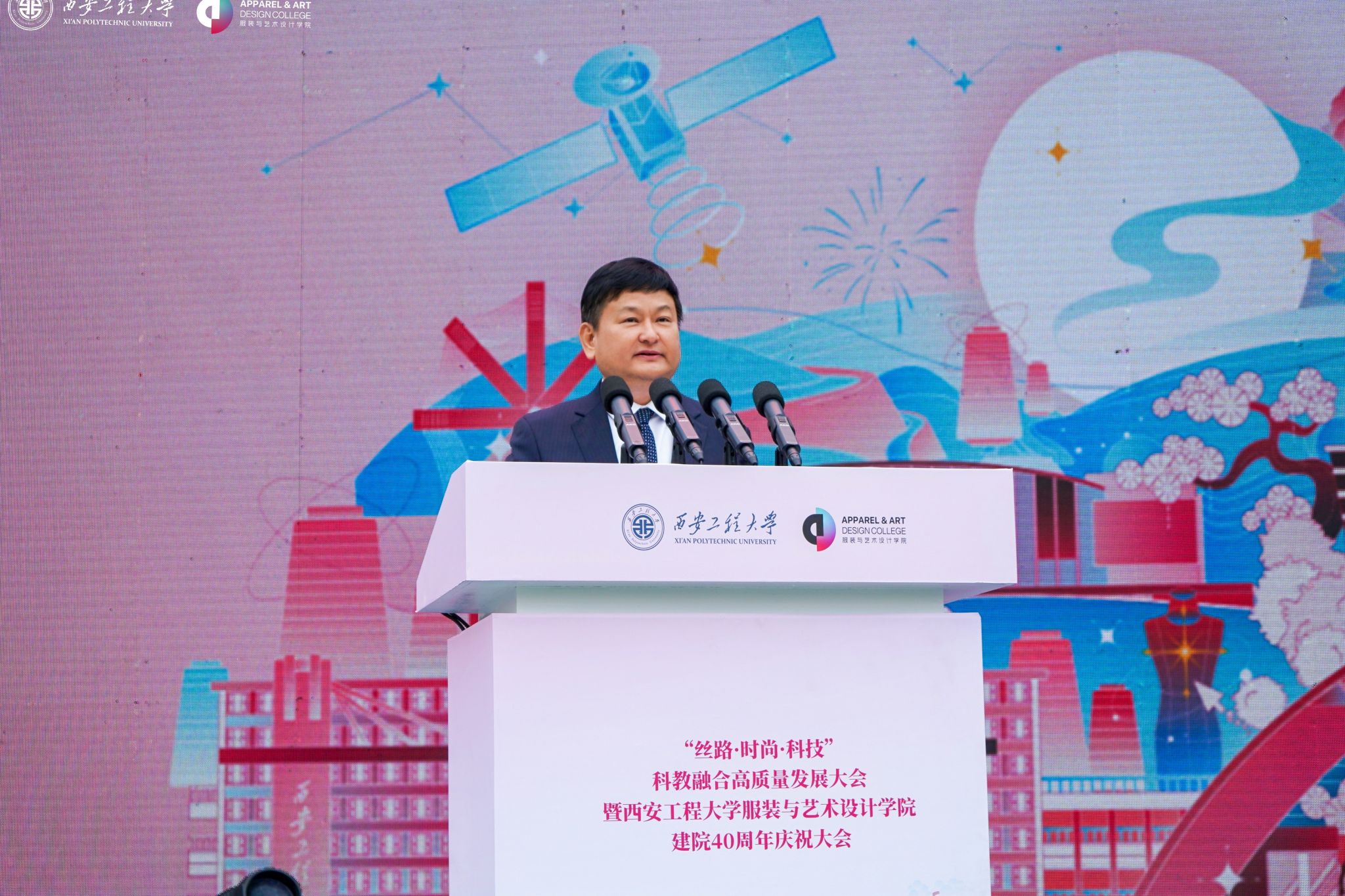 在金花校区举办“丝路 时尚 科技”科教融合高质量发展大会暨建院四十周年庆祝大会。校领导马万清、朱永民、戴鸿、夏蔡娟、张洛红,国内相关领域专家学者、行业领军人物、企业代表及支持学院发展的社会各界朋友,学院老领导、离退休教师代表,校友代表,学校各职能部门负责人及学院师生共4000余人欢聚校园,共庆华诞。