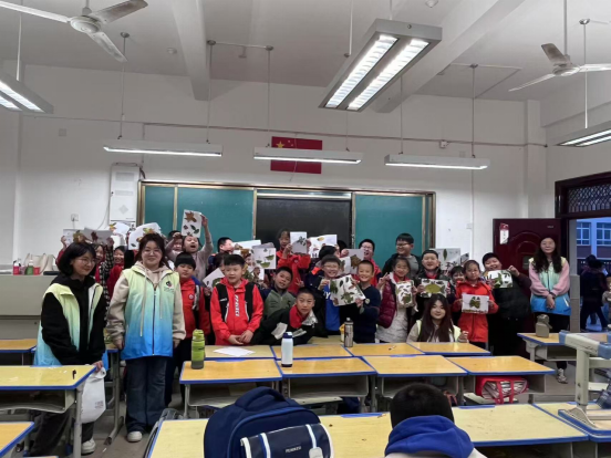 课程结束后,小朋友们争先恐后的上台展示自己的作品,脸上洋溢着自豪与喜悦。志愿者们与小朋友们合影留念,共同定格下了这美好而难忘的时刻。本次“寻悦金秋,趣玩趣造”美育特色社团课程,不仅让康复路小学的小朋友们在轻松愉快的氛围中增长了知识,锻炼了他们的协作能力与动手能力,还在他们心中播种下了热爱自然、勇于探索的种子。