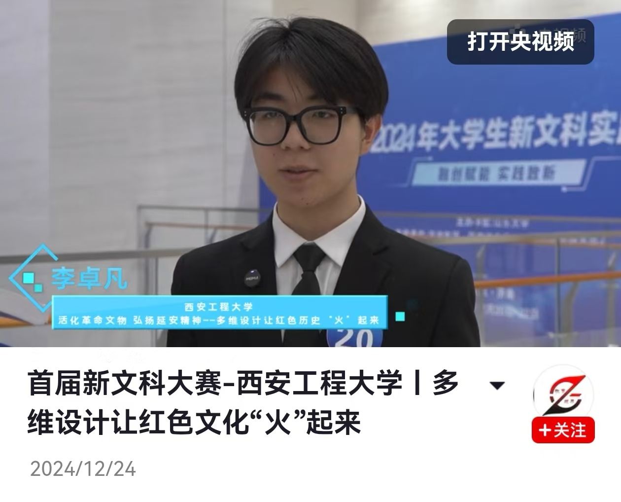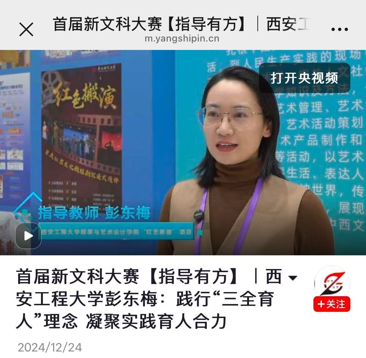 彭东梅和马克思主义学院刘敏两位教师共同指导,彭冬梅及其团队成员李卓凡同学代表团队接受央视频APP教育视界栏目采访,深入讲解红色文化多维设计成果。