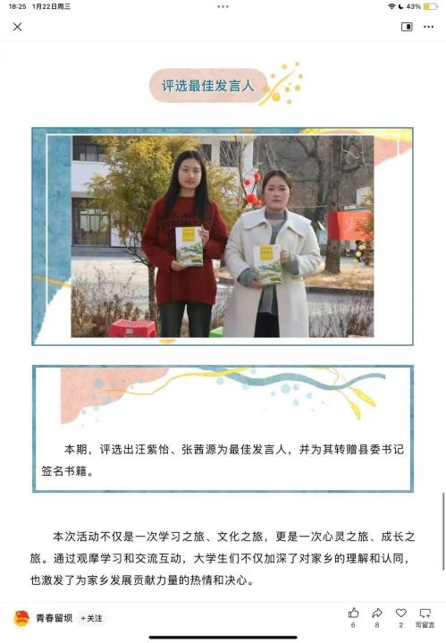 舞狮民宿添经历,底蕴潜能尽感知。寒假期间,24级设计10班的汪紫怡同学回到了她的家乡,选择以一种特别的方式体验和感受家乡的魅力。她投身于家乡的传统文化和乡村发展新貌中,参与了舞狮表演和民宿参观活动。通过这些活动,汪紫怡不仅积累了宝贵的实践经验,还深刻感受到了家乡的文化底蕴和发展潜力。她的努力和热情,让她在同学们中脱颖而出,荣获了“最佳发言人”的称号,并获得了当地县委书记亲笔签名的书籍奖励。同时,“青春留坝”公众号也对她们的实践经历进行了专题报道,进一步扩大了活动的影响力。这次返乡实践,对汪紫怡来说是一次难忘的心灵之旅和成长之旅。她表示,未来将带着这份对家乡的爱与责任,努力学习专业知识,为家乡的发展贡献自己的力量。