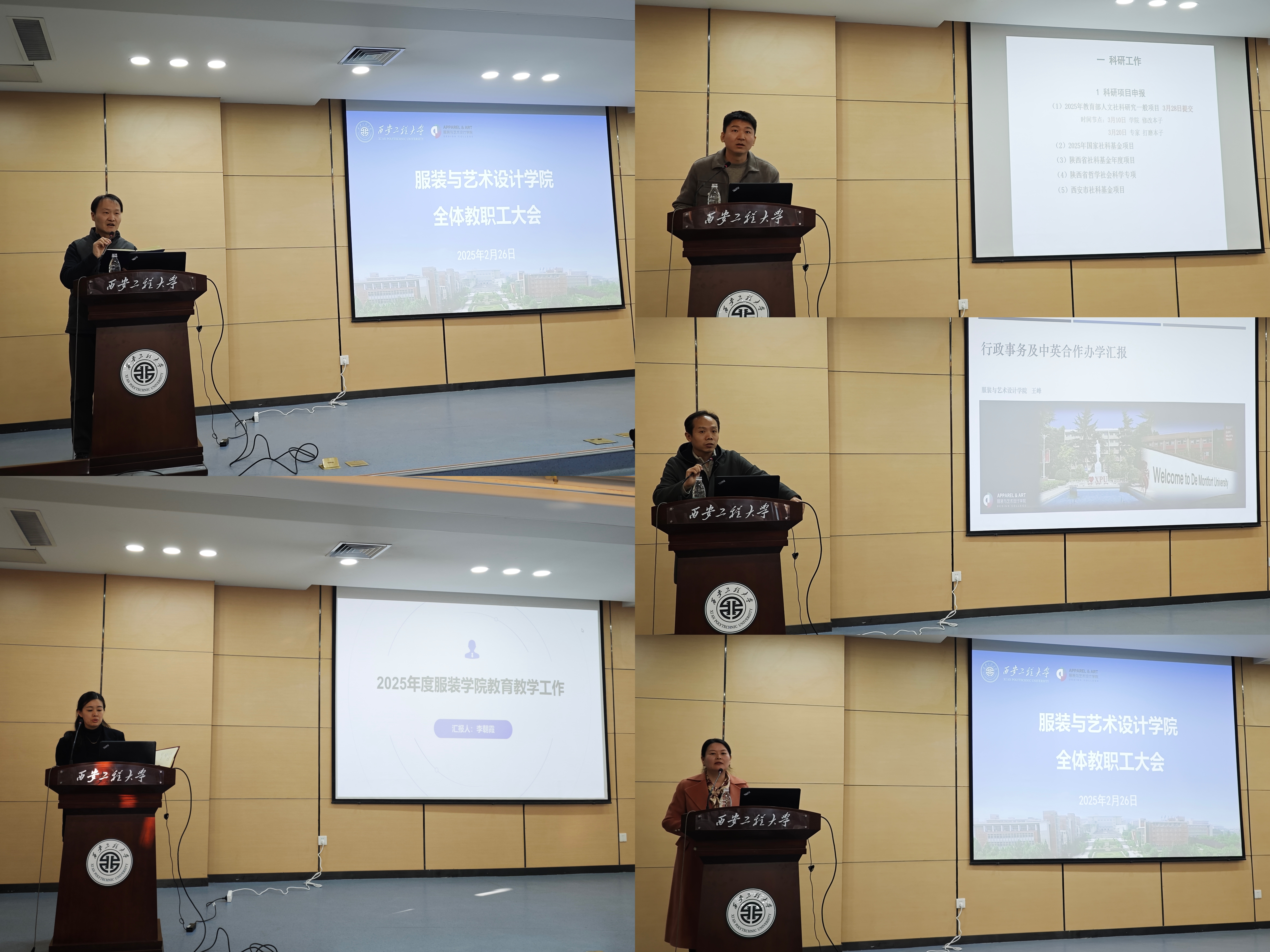 院党委书记苏博指出,当前学院正处于机遇与挑战并存的关键时期,2025年作为改革之年,全院上下必须团结一心、协同联动。他强调,要严守安全底线,加强校园安全管理,切实保障师生的人身财产安全;深入推进党风廉政建设,营造风清气正的政治生态;持续强化师德师风建设,提升教师职业道德素养;严格落实意识形态工作责任制,牢牢把握正确的政治方向。希望全体教职工以饱满的热情和昂扬的斗志投入工作,为学院事业发展贡献智慧和力量,共同推动学院迈向新的高度。副院长(主持日常工作)刘凯旋深入剖析了学院设计学的现状与发展态势,通过对全国开设艺术设计学专业的高校进行全面分析,精准把握学院面临的机遇与挑战。他强调,要聚焦交叉学科发展,突出陕西地域特色与服装专业的融合,探索特色发展路径,注重科研与教学协同发展。