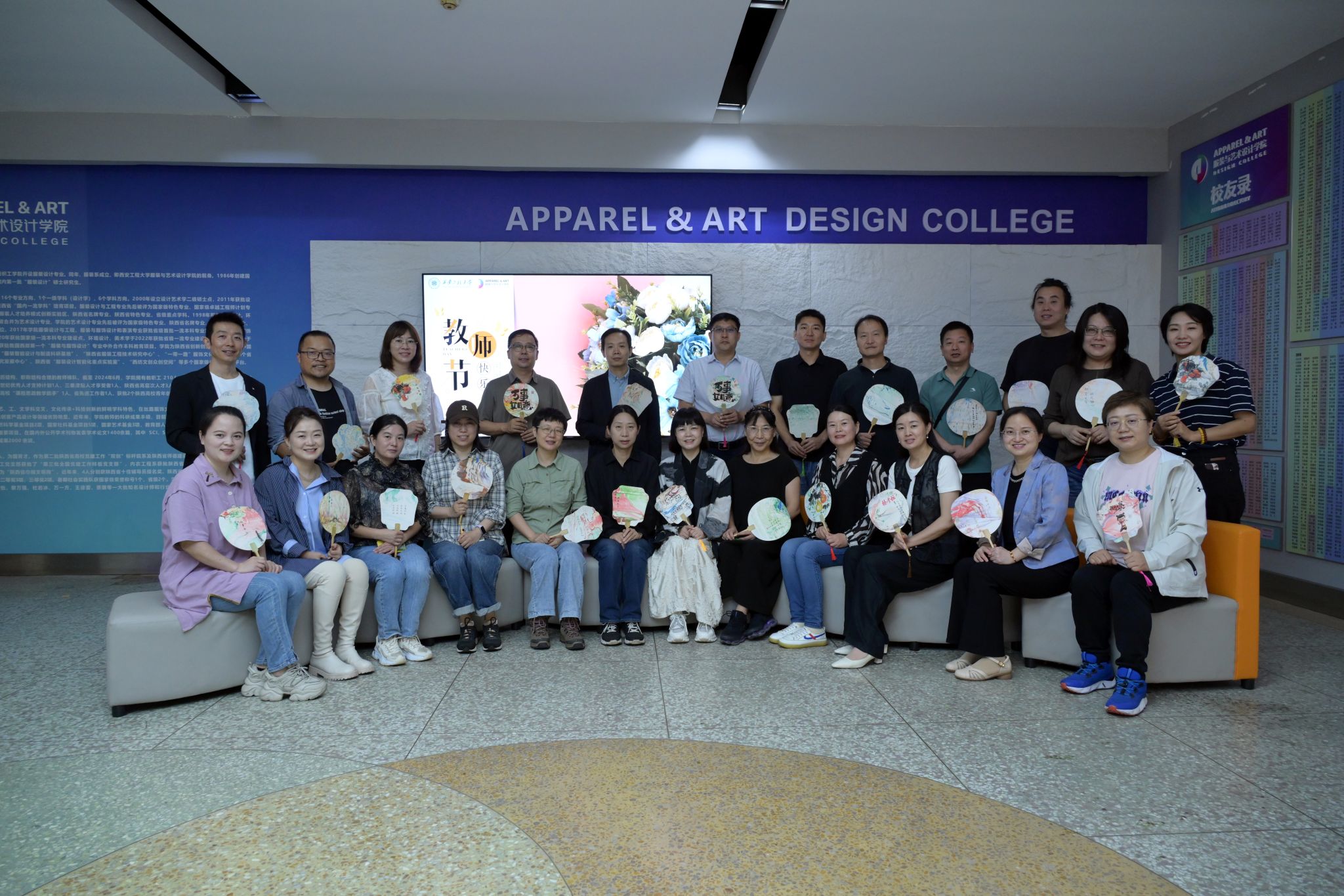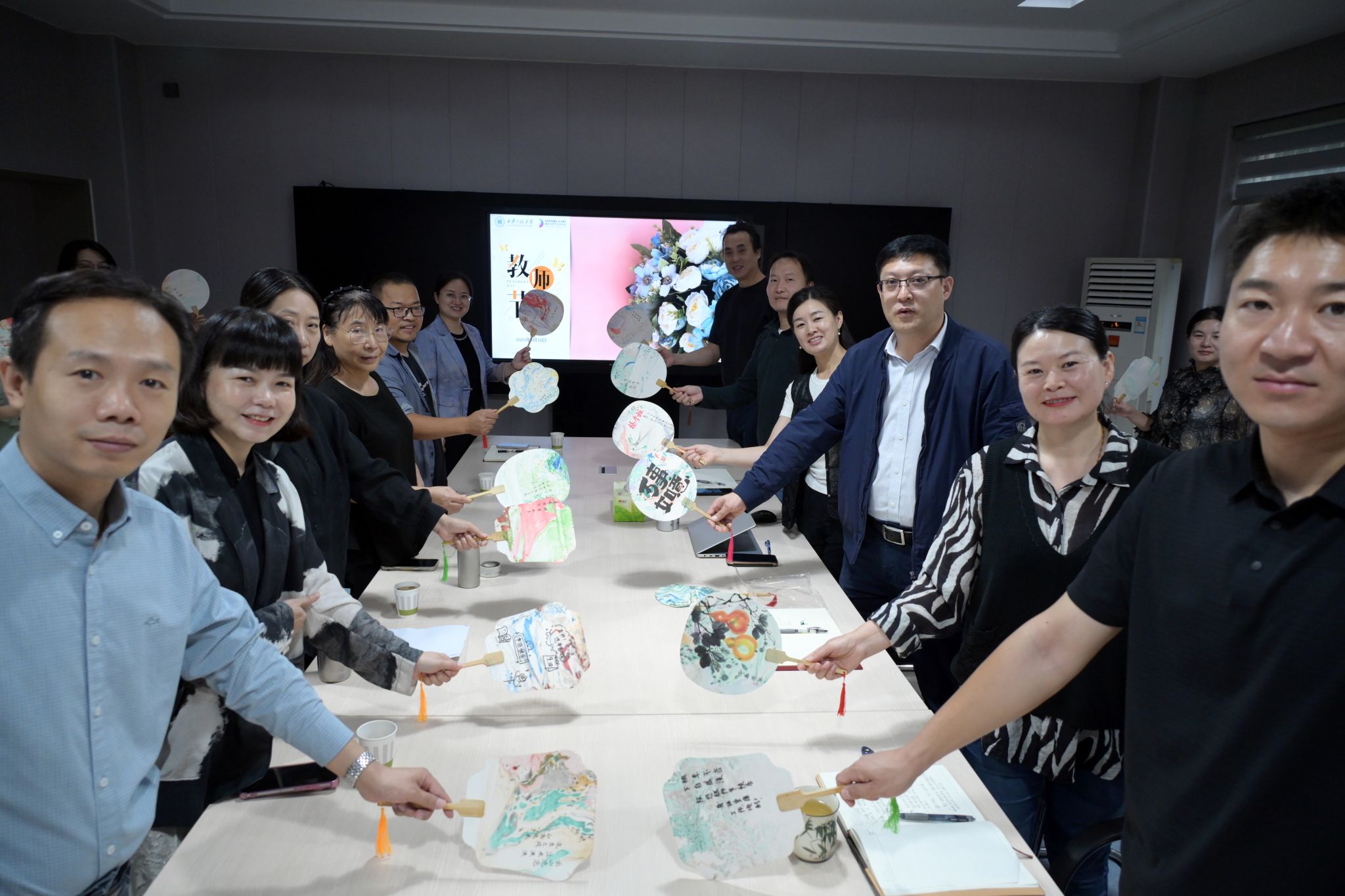 会后,学生代表向老师们送上了亲手制作的非遗漆扇以表达节日祝福。这些漆扇出自不同专业的学生之手,扇面印有融合专业特色的图案,将非遗技艺与专业美学巧妙结合。学生们表示,制作时总想起老师讲授传统工艺时的专注神情,“希望把这份匠心与敬意,融进扇面之中。”