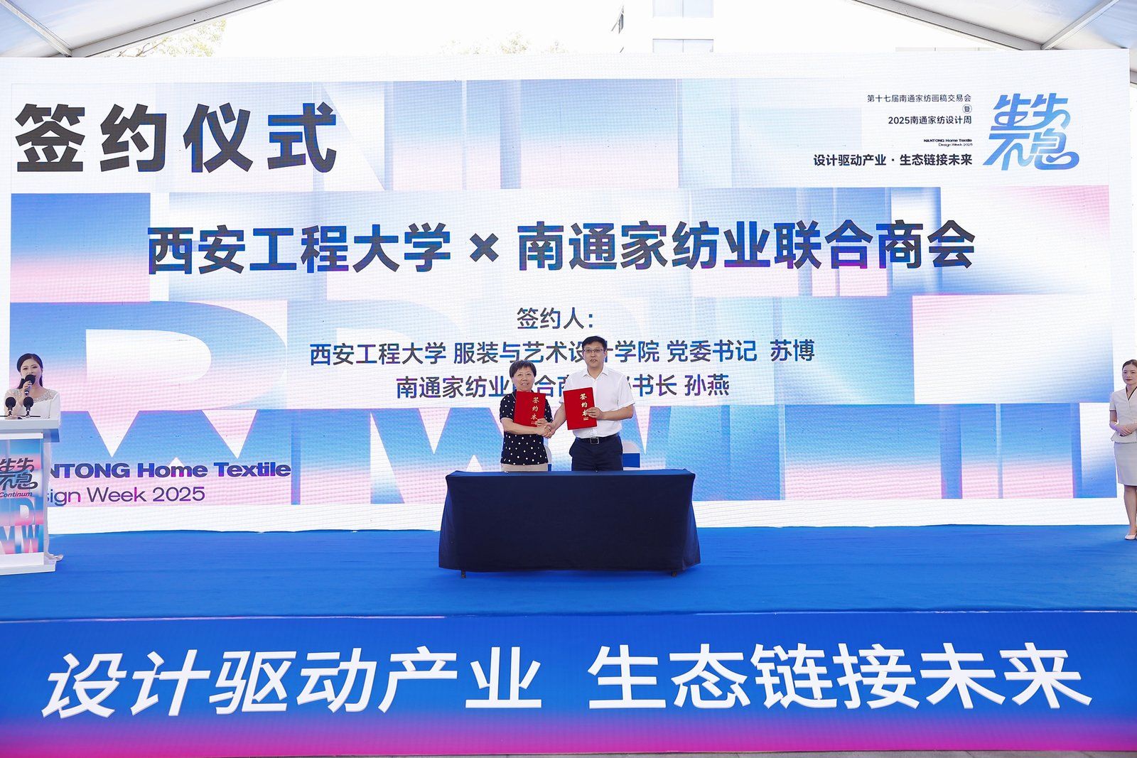 开幕式上,学院党委书记苏博代表学院与南通家纺业联合商会签署战略合作协议,双方将在设计研发、人才培养、成果转化等方面开展深度合作,推动产教融合,为学生构建“教学—实践—就业”贯通渠道。展会期间,学院团队与中国美术学院、东华大学等11所高校开展教学交流,围绕家纺数字化课程、毕业设计产业对接等议题交换经验。团队还走访了金太阳、慕写等设计公司,实地了解生产流程与市场经验,为教学注入行业视角。