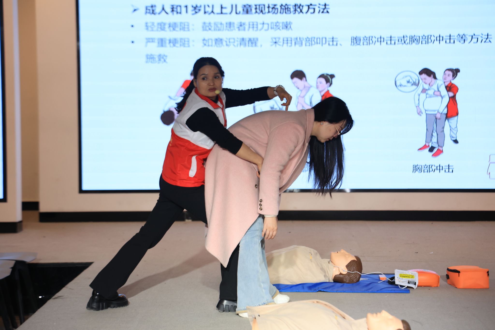 本次培训紧扣女教职工工作生活实际,讲师围绕心肺复苏核心知识,结合女性在家庭、校园的常见急救场景,重点讲解胸外按压、开放气道、人工呼吸及气道异物梗阻施救等关键技能,细致剖析操作中的生理特点与注意事项,传递“敢于施救、科学施救”的理念。
