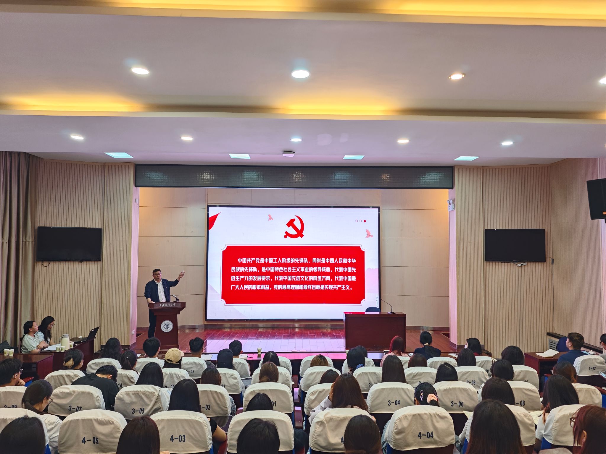 专题授课环节,苏博带领学员回顾党的百年奋斗历程与新时代发展成就,阐释伟大建党精神的深刻内涵;结合典型案例,深入解读意识形态安全的重要性,剖析历史虚无主义的危害,引导学员守好思想防线;同时围绕党员权利义务、正确政绩观、中央八项规定精神及梦桃精神等内容,结合学院专业特色,勉励学员以延安精神铸魂、梦桃精神励行,践行 “衣被天下、设计为民,向美而行”的使命担当。苏博强调五一假期期间学生党员与学生骨干需起到带头作用,做好安全稳定工作。