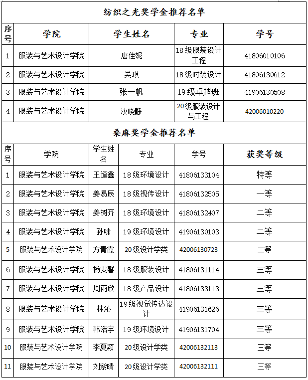 根据韩h漫 《关于做好2020-2021学年学生纺织之光、桑麻奖学金评审工作的通知》的评选要求,经各年级初评,学院审核,现将韩h漫 2021年纺织之光、桑麻奖学金推荐名单进行公示。公示时间为2021年9月10日至9月14日。如有异议,请于公示期内向所在年级辅导员反映。