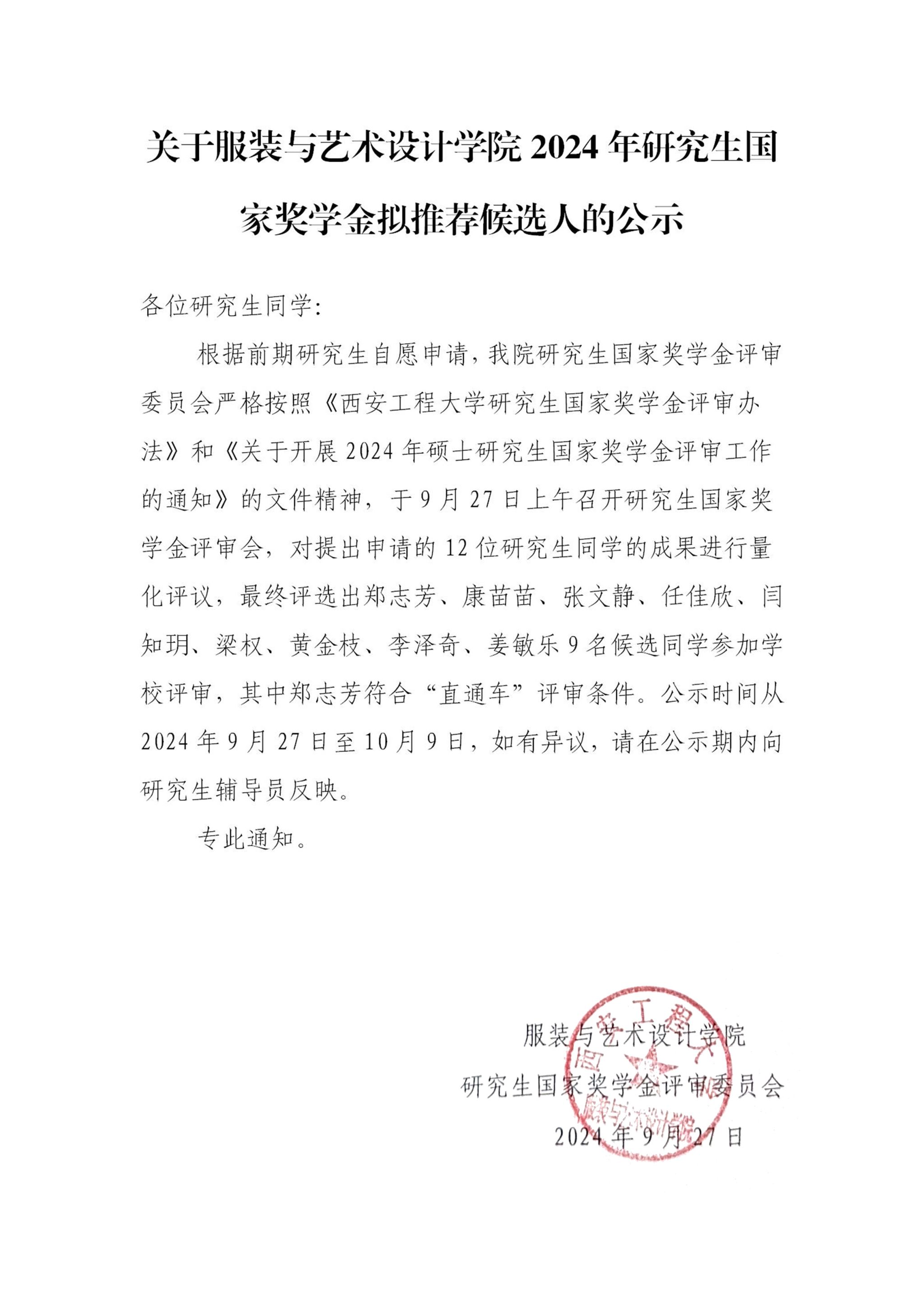 关于韩h漫 2024年研究生国家奖学金拟推荐候选人的公示