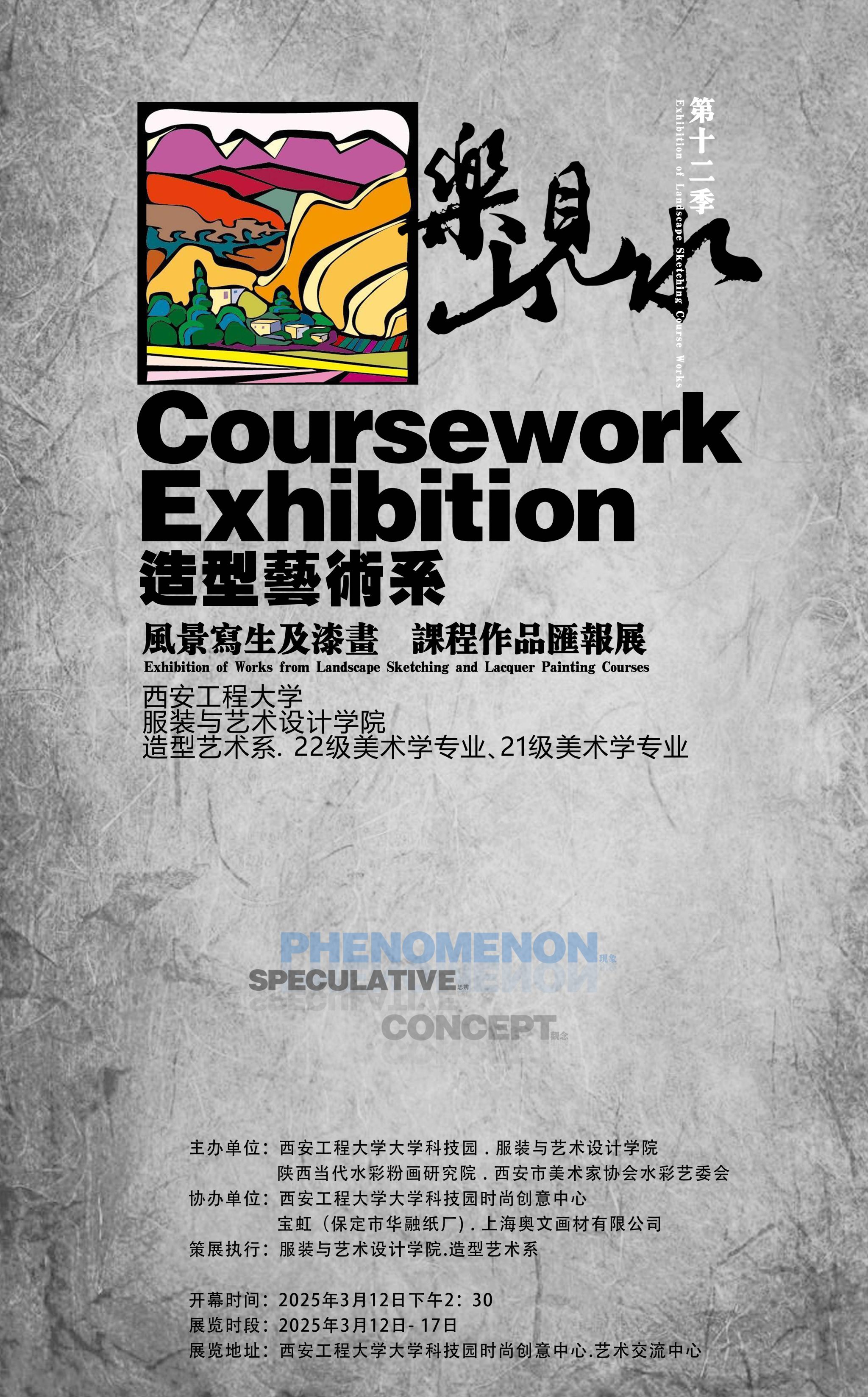 造型艺术系策展执行,2022级美术学专业《风景写生》实践课程和2021级美术学专业《漆画》课程作品联展。所有作品均为学生实践创作,强调归纳总结、样式技法、现场感受等方面的综合能力。作品展区分两个板块,其中油画和水彩画80余副,漆画作品50余副。