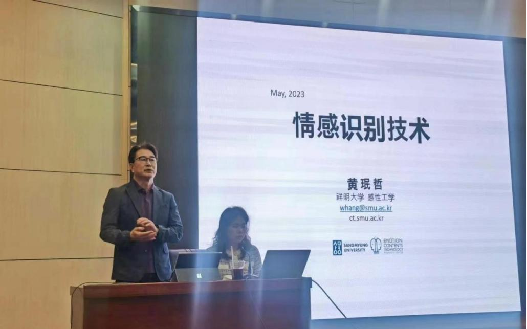 讲座邀请韩国祥明大学融合工学院院长黄珉哲教授就情感属性和情感识别技术等内容进行了两个小时的专题分享。黄珉哲教授博士毕业于生物医学工程专业,毕业后一直致力于情感识别技术的开发和应用研究,期间创建了感性工学学科,emotion lab工作室,发表情感认知技术SCI论文153篇,出版专著4部,获得技术开发专利数十项。情感认知技术是一门综合计算机科学、设计、医学、心理学、医学工程等多学科的交叉领域,黄珉哲教授以自身多年的研究为依托,生动细致地解读了“情感认知技术”这一主题,报告内容以情感在沟通中的重要性、情感的分类、情感产生的生理变化和情感识别技术四个角度为切入点,由浅入深,由现象到本质,将情感识别技术的重要性和时代性,做了详细的讲解,同时提出情感技术现在和将来可能发展的四个方向,一是将变革以人类体验为中心的行业和人类机能环境;二是模拟感性数字化的标准化是科学化的前提;三是认知科学和人文学科的一致性至关重要;四是融合技术是创造新价值的关键技术。此后,结合情感认知技术基础理论,对研究室成果转化项目也做了简单的介绍,其技术成果得到了老师和同学们的一致认可。